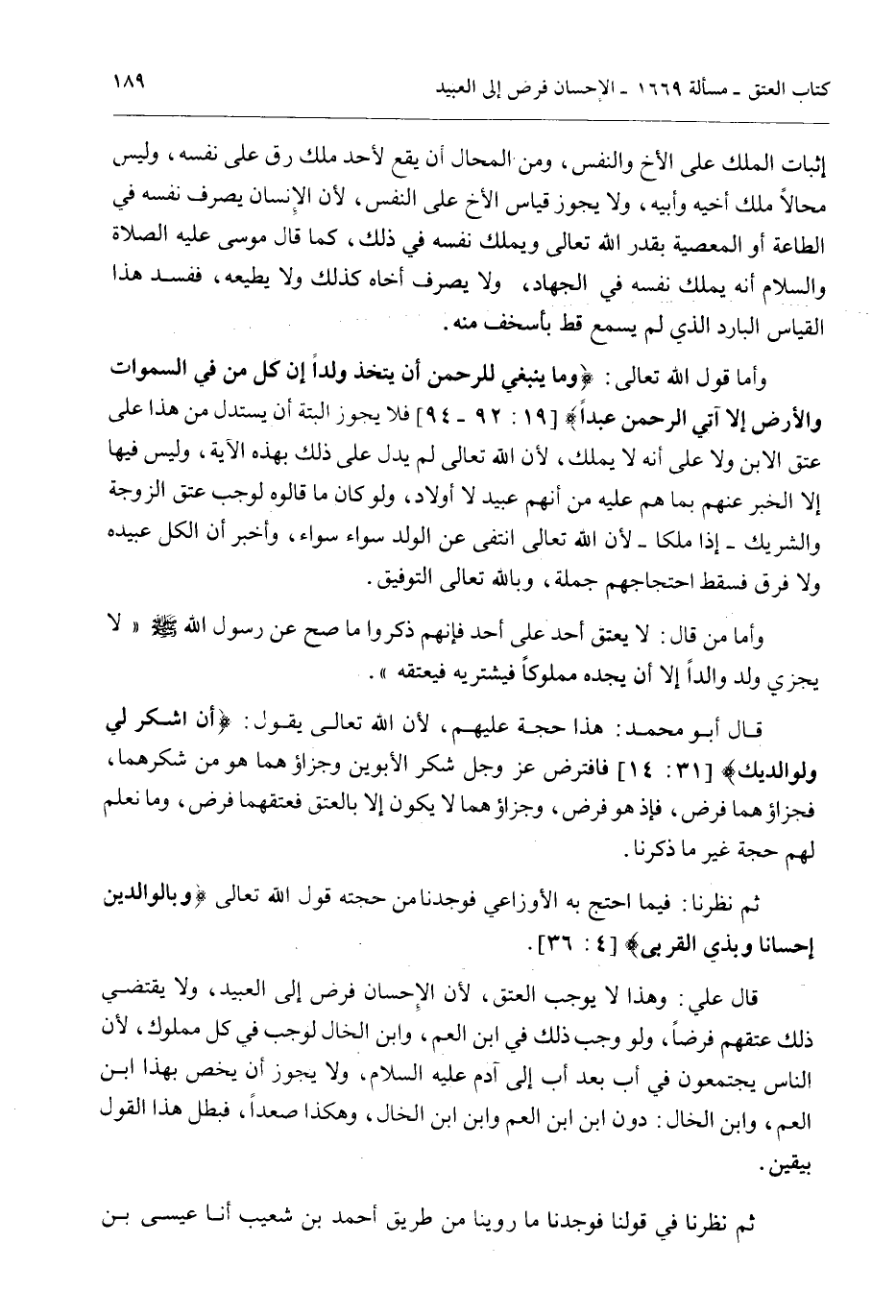 قَالَ عَلِيٌّ: وَهَذَا لَا يُوجِبُ الْعِتْقَ؛ لِأَنَّ الْإِحْسَانَ فُرِضَ إلَى الْعَبِيدِ، وَلَا يَقْتَضِي ذَلِكَ عِتْقَهُمْ فَرْضًا، وَلَوْ وَجَبَ ذَلِكَ فِي ابْنِ الْعَمِّ، وَابْنِ الْخَال لَوَجَبَ فِي كُلِّ مَمْلُوكٍ؛ لِأَنَّ النَّاسَ يَجْتَمِعُونَ فِي أَبٍ بَعْدَ أَبٍ إلَى آدَمَ - عَلَيْهِ السَّلَامُ -، وَلَا يَجُوزُ أَنْ يَخُصَّ بِهَذَا ابْنَ الْعَمِّ، وَابْنَ الْخَالِ: دُونَ ابْنِ ابْنِ الْعَمِّ وَابْنِ ابْنِ الْخَالِ، وَهَكَذَا صَعَدًا، فَبَطَلَ هَذَا الْقَوْلُ بِيَقِينٍ.