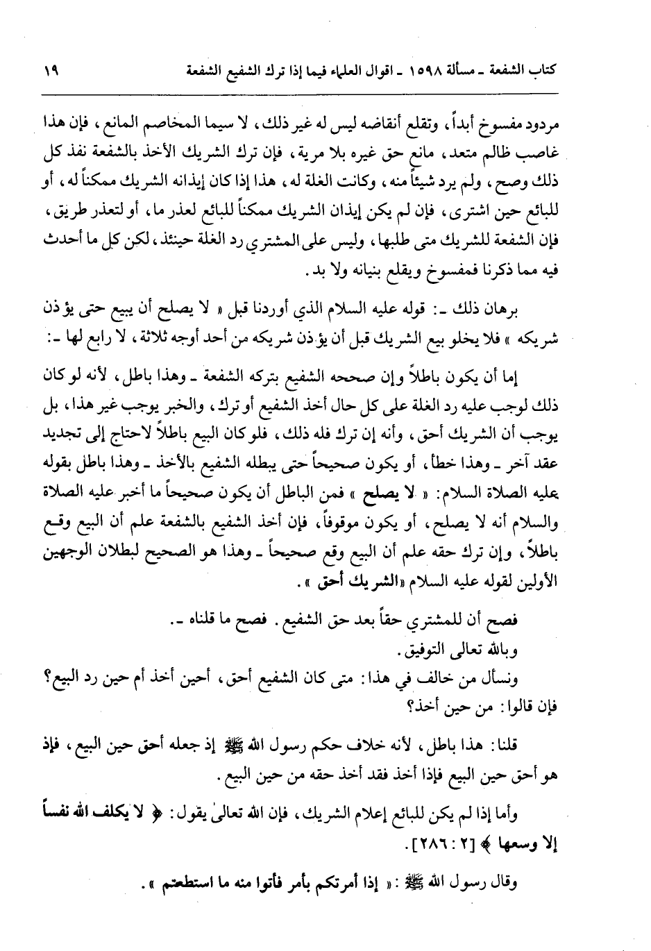 وَنَسْأَلُ مَنْ خَالَفَ فِي هَذَا: مَتَى كَانَ الشَّفِيعُ أَحَقَّ، أَحِينَ أَخَذَ أَمْ حِينَ رَدَّ الْبَيْعَ؟ فَإِنْ قَالُوا: مِنْ حِينِ أَخَذَ؟ قُلْنَا: هَذَا بَاطِلٌ؛ لِأَنَّهُ خِلَافُ حُكْمِ رَسُولِ اللَّهِ - صَلَّى اللَّهُ عَلَيْهِ وَسَلَّمَ - إذْ جَعَلَهُ أَحَقَّ حِينَ الْبَيْعِ، فَإِذْ هُوَ أَحَقُّ حِينَ الْبَيْعِ فَإِذَا أَخَذَ فَقَدْ أَخَذَ حَقَّهُ مِنْ حِينِ الْبَيْعِ.