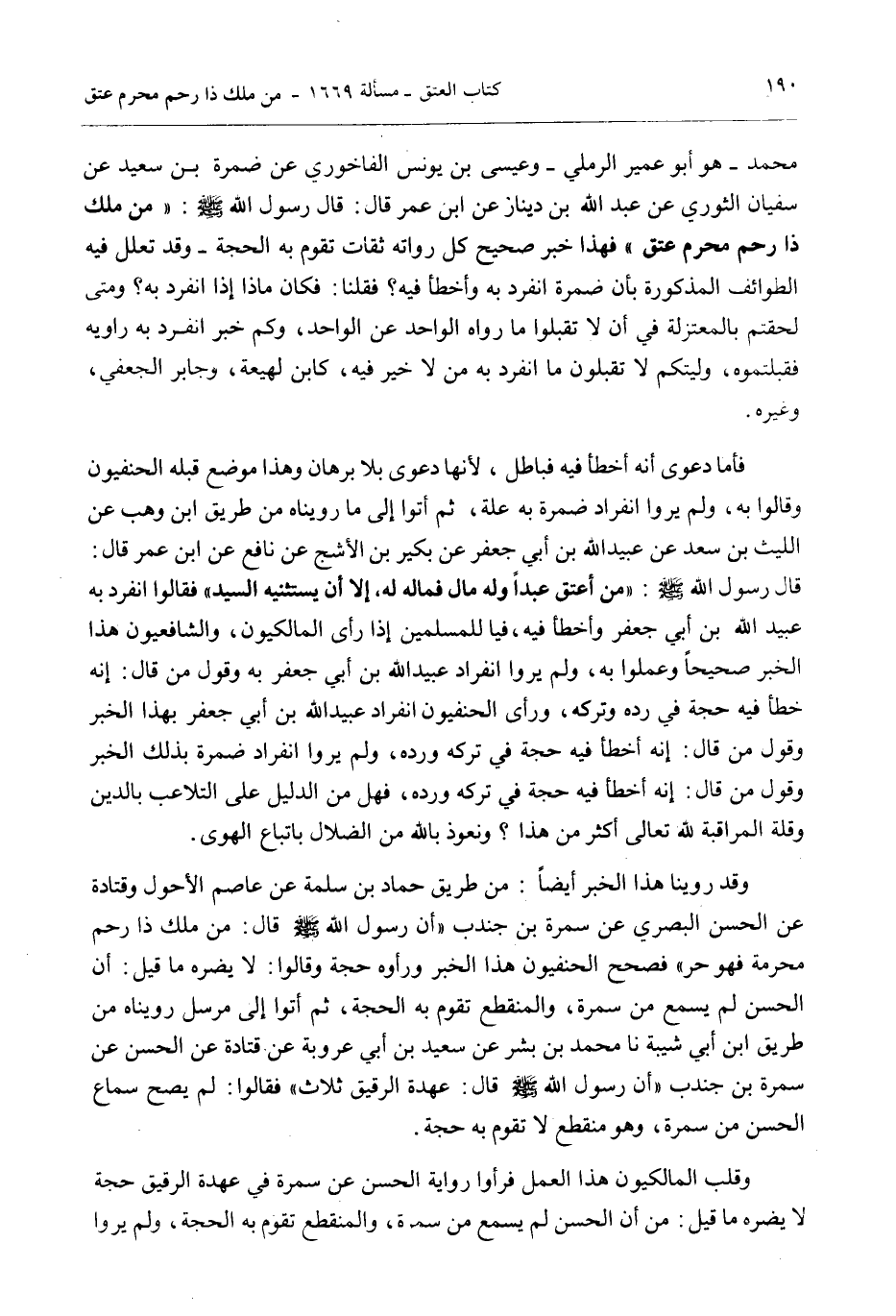 عِيسَى بْنُ مُحَمَّدٍ - هُوَ أَبُو عُمَيْرٍ الرَّمْلِيُّ - وَعِيسَى بْنُ يُونُسَ الْفَاخُورِيُّ عَنْ ضَمْرَةَ بْنِ سَعِيدٍ عَنْ سُفْيَانَ الثَّوْرِيِّ عَنْ عَبْدِ اللَّهِ بْنِ دِينَارٍ عَنْ ابْنِ عُمَرَ قَالَ: قَالَ رَسُولُ اللَّهِ - صَلَّى اللَّهُ عَلَيْهِ وَسَلَّمَ -: «مَنْ مَلَكَ ذَا رَحِمٍ مَحْرَمٍ عَتَقَ» فَهَذَا خَبَرٌ صَحِيحٌ كُلُّ رُوَاتِهِ ثِقَاتٌ تَقُومُ بِهِ الْحُجَّةُ - وَقَدْ تَعَلَّلَ فِيهِ الطَّوَائِفُ الْمَذْكُورَةُ بِأَنَّ ضَمْرَةَ انْفَرَدَ بِهِ وَأَخْطَأَ فِيهِ.
