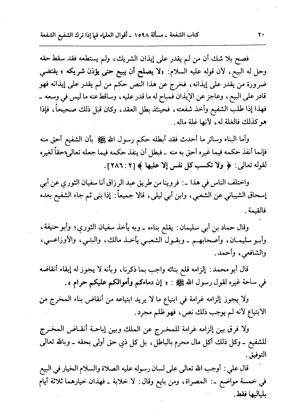 وَأَمَّا الْبِنَاءُ وَسَائِرُ مَا أَحْدَثَ فَقَدْ أَبْطَلَهُ حُكْمُ رَسُولِ اللَّهِ - صَلَّى اللَّهُ عَلَيْهِ وَسَلَّمَ - بِأَنَّ الشَّفِيعَ أَحَقُّ مِنْهُ فَإِنَّمَا أَنْفَذَ حُكْمَهُ فِيمَا غَيْرُهُ أَحَقُّ بِهِ مِنْهُ فَبَطَلَ أَنْ يَنْفُذَ حُكْمُهُ فِيمَا جَعَلَهُ تَعَالَى حَقًّا لِغَيْرِهِ لِقَوْلِهِ تَعَالَى: {وَلا تَكْسِبُ كُلُّ نَفْسٍ إِلا عَلَيْهَا} [الأنعام: 164]