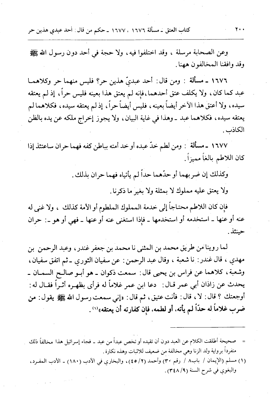 1677 - مَسْأَلَةٌ: وَمَنْ لَطَمَ خَدَّ عَبْدِهِ أَوْ خَدَّ أَمَتِهِ بِبَاطِنِ كَفِّهِ فَهُمَا حُرَّانِ سَاعَتَئِذٍ إذَا كَانَ اللَّاطِمُ بَالِغًا مُمَيِّزًا. وَكَذَلِكَ إنْ ضَرَبَهُمَا أَوْ حَدَّهُمَا حَدًّا لَمْ يَأْتِيَاهُ فَهُمَا حُرَّانِ بِذَلِكَ. وَلَا يُعْتَقُ عَلَيْهِ مَمْلُوكٌ لَا بِمُثْلَةٍ وَلَا بِغَيْرِ مَا ذَكَرْنَا.