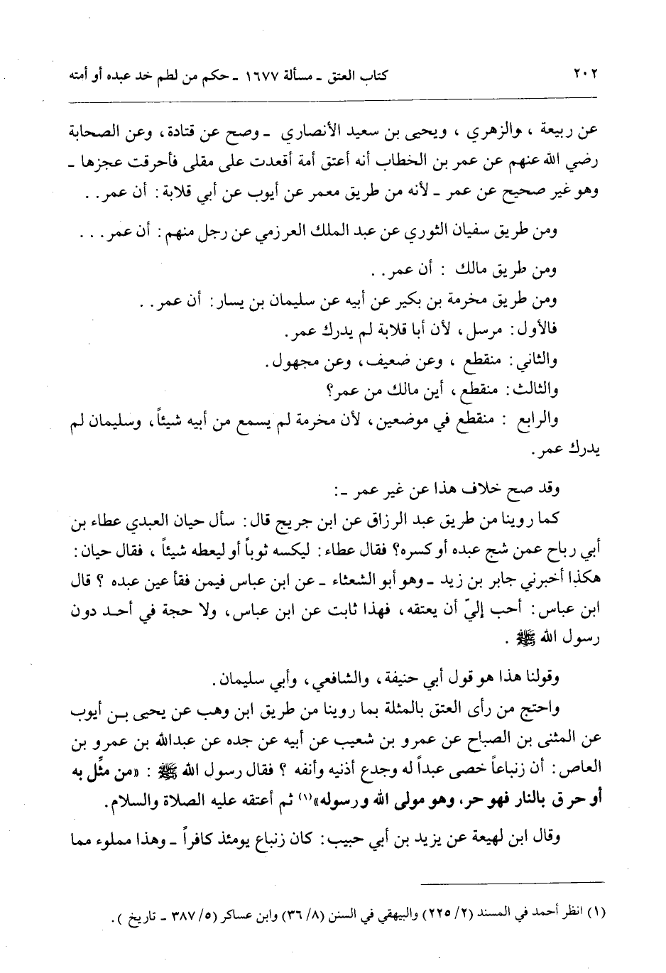 عَنْ رَبِيعَةَ، وَالزُّهْرِيِّ، وَيَحْيَى بْنِ سَعِيدٍ الْأَنْصَارِيِّ - وَصَحَّ عَنْ قَتَادَةَ، وَعَنْ الصَّحَابَةِ - رَضِيَ اللَّهُ عَنْهُمْ - عَنْ عُمَرَ بْنِ الْخَطَّابِ أَنَّهُ أَعْتَقَ أَمَةً أُقْعِدَتْ عَلَى مَقْلَى فَأَحْرَقَتْ عَجُزَهَا - وَهُوَ غَيْرُ صَحِيحٍ عَنْ عُمَرَ - لِأَنَّهُ مِنْ طَرِيقِ مَعْمَرٍ عَنْ أَيُّوبَ عَنْ أَبِي قِلَابَةَ: أَنَّ عُمَرَ، وَمِنْ طَرِيقِ سُفْيَانَ الثَّوْرِيِّ عَنْ عَبْدِ الْمَلِكِ الْعَرْزَمِيِّ عَنْ رَجُلٍ مِنْهُمْ: أَنَّ عُمَرَ، وَمِنْ طَرِيقِ مَالِكٍ: أَنَّ عُمَرَ، وَمِنْ طَرِيقِ مَخْرَمَةَ بْنِ بُكَيْرٍ عَنْ أَبِيهِ عَنْ سُلَيْمَانَ بْنِ يَسَارٍ: أَنَّ عُمَرَ، فَالْأَوَّلُ: مُرْسَلٌ؛ لِأَنَّ أَبَا قِلَابَةَ لَمْ يُدْرِكْ عُمَرَ. وَالثَّانِي: مُنْقَطِعٌ، وَعَنْ ضَعِيفٍ، وَعَنْ مَجْهُولٍ. وَالثَّالِثُ: مُنْقَطِعٌ، أَيْنَ مَالِكٌ مِنْ عُمَرَ؟ وَالرَّابِعُ: مُنْقَطِعٌ فِي مَوْضِعَيْنِ، لِأَنَّ مَخْرَمَةَ لَمْ يَسْمَعْ مِنْ أَبِيهِ شَيْئًا، وَسُلَيْمَانُ لَمْ يُدْرِكْ عُمَرَ. وَقَدْ صَحَّ خِلَافُ هَذَا عَنْ غَيْرِ عُمَرَ. كَمَا رُوِّينَا مِنْ طَرِيقِ عَبْدِ الرَّزَّاقِ عَنْ ابْنِ جُرَيْجٍ قَالَ: سَأَلَ حَيَّانُ الْعَبْدِيُّ عَطَاءَ بْنَ أَبِي رَبَاحٍ عَمَّنْ شَجَّ عَبْدَهُ أَوْ كَسَرَهُ؟ فَقَالَ عَطَاءٌ: لِيَكْسُهُ ثَوْبًا أَوْ لِيُعْطِهِ شَيْئًا، فَقَالَ حَيَّانُ: هَكَذَا أَخْبَرَنِي جَابِرُ بْنُ زَيْدٍ - وَهُوَ أَبُو الشَّعْثَاءِ - عَنْ ابْنِ عَبَّاسٍ فِيمَنْ فَقَأَ عَيْنَ عَبْدِهِ؟ قَالَ ابْنُ عَبَّاسٍ: أَحَبُّ إلَيَّ أَنْ يُعْتِقَهُ، فَهَذَا ثَابِتٌ عَنْ ابْنِ عَبَّاسٍ، وَلَا حُجَّةَ فِي أَحَدٍ دُونَ رَسُولِ اللَّهِ - صَلَّى اللَّهُ عَلَيْهِ وَسَلَّمَ -. وَقَوْلُنَا هَذَا هُوَ قَوْلُ أَبِي حَنِيفَةَ، وَالشَّافِعِيِّ، وَأَبِي سُلَيْمَانَ. وَاحْتَجَّ مَنْ رَأَى الْعِتْقَ بِالْمُثْلَةِ بِمَا رُوِّينَا مِنْ طَرِيقِ ابْنِ وَهْبٍ عَنْ يَحْيَى بْنِ أَيُّوبَ عَنْ الْمُثَنَّى بْنِ الصَّبَّاحِ عَنْ عَمْرِو بْنِ شُعَيْبٍ عَنْ أَبِيهِ عَنْ جَدِّهِ عَنْ عَبْدِ اللَّهِ بْنِ عَمْرِو بْنِ الْعَاصِ: «أَنَّ زِنْبَاعًا خَصَى عَبْدًا لَهُ وَجَدَعَ أُذُنَيْهِ وَأَنْفَهُ؟ فَقَالَ رَسُولُ اللَّهِ - صَلَّى اللَّهُ عَلَيْهِ وَسَلَّمَ -: مَنْ مُثِّلَ بِهِ أَوْ حُرِّقَ بِالنَّارِ فَهُوَ حُرٌّ، وَهُوَ مَوْلَى اللَّهِ وَرَسُولِهِ ثُمَّ أَعْتَقَهُ - عَلَيْهِ الصَّلَاةُ وَالسَّلَامُ -» . وَقَالَ ابْنُ لَهِيعَةَ عَنْ يَزِيدَ بْنِ أَبِي حَبِيبٍ: كَانَ زِنْبَاعٌ يَوْمَئِذٍ كَافِرًا - وَهَذَا مَمْلُوءٌ مِمَّا