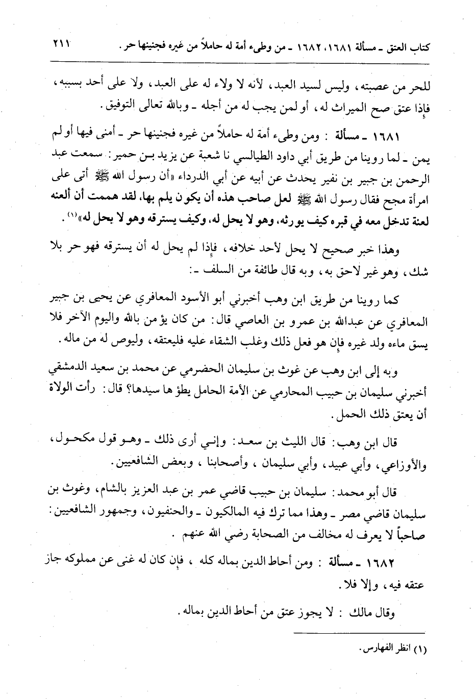 1681 - مَسْأَلَةٌ: وَمَنْ وَطِئَ أَمَةً لَهُ حَامِلًا مِنْ غَيْرِهِ فَجَنِينُهَا حُرٌّ - أَمْنَى فِيهَا أَوْ لَمْ يُمْنِ - لِمَا رُوِّينَا مِنْ طَرِيقِ أَبِي دَاوُد الطَّيَالِسِيِّ نا شُعْبَةُ عَنْ يَزِيدَ بْنِ حِمْيَرٍ: سَمِعْت عَبْدَ الرَّحْمَنِ بْنَ جُبَيْرِ بْنِ نُفَيْرٍ يُحَدِّثُ عَنْ أَبِيهِ عَنْ أَبِي الدَّرْدَاءِ «أَنَّ رَسُولَ اللَّهِ - صَلَّى اللَّهُ عَلَيْهِ وَسَلَّمَ - أَتَى عَلَى امْرَأَةٍ مُجِحٍّ فَقَالَ رَسُولُ اللَّهِ - صَلَّى اللَّهُ عَلَيْهِ وَسَلَّمَ - لَعَلَّ صَاحِبَ هَذِهِ أَنْ يَكُونَ يُلِمُّ بِهَا، لَقَدْ هَمَمْتُ أَنْ أَلْعَنَهُ لَعْنَةً تَدْخُلُ مَعَهُ فِي قَبْرِهِ كَيْفَ يُوَرِّثُهُ، وَهُوَ لَا يَحِلُّ لَهُ، وَكَيْفَ يَسْتَرِقُّهُ وَهُوَ لَا يَحِلُّ لَهُ» . وَهَذَا خَبَرٌ صَحِيحٌ لَا يَحِلُّ لِأَحَدٍ خِلَافُهُ، فَإِذَا لَمْ يَحِلَّ لَهُ أَنْ يَسْتَرِقَّهُ فَهُوَ حُرٌّ بِلَا شَكٍّ، وَهُوَ غَيْرُ لَاحِقٍ بِهِ، وَبِهِ قَالَ طَائِفَةٌ مِنْ السَّلَفِ. كَمَا رُوِّينَا مِنْ طَرِيقِ ابْنِ وَهْبٍ أَخْبَرَنِي أَبُو الْأَسْوَدِ الْمَعَافِرِيُّ عَنْ يَحْيَى بْنِ جُبَيْرٍ الْمَعَافِرِيِّ عَنْ عَبْدِ اللَّهِ بْنِ عَمْرِو بْنِ الْعَاصِ قَالَ: مَنْ كَانَ يُؤْمِنُ بِاَللَّهِ وَالْيَوْمِ الْآخِرِ فَلَا يَسْقِ مَاءَهُ وَلَدَ غَيْرِهِ فَإِنْ هُوَ فَعَلَ ذَلِكَ وَغَلَبَ الشَّقَاءُ عَلَيْهِ فَلْيُعْتِقْهُ، وَلْيُوصِ لَهُ مِنْ مَالِهِ. وَبِهِ إلَى ابْنِ وَهْبٍ عَنْ غَوْثِ بْنِ سُلَيْمَانَ الْحَضْرَمِيِّ عَنْ مُحَمَّدِ بْنِ سَعِيدٍ الدِّمَشْقِيِّ أَخْبَرَنِي سُلَيْمَانُ بْنُ حَبِيبٍ الْمُحَارِبِيُّ عَنْ الْأَمَةِ الْحَامِلِ يَطَؤُهَا سَيِّدُهَا؟ قَالَ: رَأَتْ الْوُلَاةُ أَنْ يَعْتِقَ ذَلِكَ الْحَمْلُ. قَالَ ابْنُ وَهْبٍ: قَالَ اللَّيْثُ بْنُ سَعْدٍ: وَإِنِّي أَرَى ذَلِكَ - وَهُوَ قَوْلُ مَكْحُولٍ، وَالْأَوْزَاعِيُّ، وَأَبِي عُبَيْدٍ، وَأَبِي سُلَيْمَانَ، وَأَصْحَابِنَا، وَبَعْضِ الشَّافِعِيِّينَ. قَالَ أَبُو مُحَمَّدٍ: سُلَيْمَانُ بْنُ حَبِيبٍ قَاضِي عُمَرَ بْنِ عَبْدِ الْعَزِيزِ بِالشَّامِ، وَغَوْثُ بْنُ سُلَيْمَانَ قَاضِي مِصْرَ - وَهَذَا مِمَّا تَرَكَ فِيهِ الْمَالِكِيُّونَ - وَالْحَنَفِيُّونَ، وَجُمْهُورُ الشَّافِعِيِّينَ: صَاحِبًا لَا يُعْرَفُ لَهُ مُخَالِفٌ مِنْ الصَّحَابَةِ - رَضِيَ اللَّهُ عَنْهُمْ -.