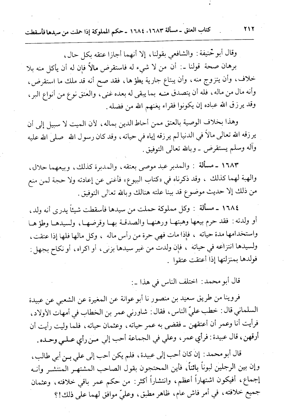 1684 - مَسْأَلَةٌ: وَكُلُّ مَمْلُوكَةٍ حَمَلَتْ مِنْ سَيِّدِهَا فَأَسْقَطَتْ شَيْئًا يُدْرَى أَنَّهُ وَلَدٌ، أَوْ وَلَدَتْهُ: فَقَدْ حَرُمَ بَيْعُهَا وَهِبَتُهَا وَرَهْنُهَا وَالصَّدَقَةُ بِهَا وَقَرْضُهَا، وَلِسَيِّدِهَا وَطْؤُهَا وَاسْتِخْدَامُهَا مُدَّةَ حَيَاتِهِ، فَإِذَا مَاتَ فَهِيَ حُرَّةٌ مِنْ رَأْسِ مَالِهِ، وَكُلُّ مَالِهَا فَلَهَا إذَا عَتَقَتْ، وَلِسَيِّدِهَا انْتِزَاعُهُ فِي حَيَاتِهِ، فَإِنْ وَلَدَتْ مِنْ غَيْرِ سَيِّدِهَا بِزِنًا، أَوْ إكْرَاهٍ، أَوْ نِكَاحٍ بِجَهْلٍ: فَوَلَدُهَا بِمَنْزِلَتِهَا إذَا أُعْتِقَتْ عَتَقُوا. قَالَ أَبُو مُحَمَّدٍ: اخْتَلَفَ النَّاسُ فِي هَذَا. فَرُوِّينَا مِنْ طَرِيقِ سَعْدِ بْنِ مَنْصُورٍ نا أَبُو عَوَانَةَ عَنْ الْمُغِيرَةِ عَنْ الشَّعْبِيِّ عَنْ عَبِيدَةُ السَّلْمَانِيِّ قَالَ: خَطَبَ عَلِيٌّ النَّاسَ، فَقَالَ: شَاوَرَنِي عُمَرُ بْنُ الْخَطَّابِ فِي أُمَّهَاتِ الْأَوْلَادِ، فَرَأَيْت أَنَا وَعُمَرُ أَنْ أُعْتِقَهُنَّ - فَقَضَى بِهِ عُمَرُ حَيَاتَهُ، وَعُثْمَانُ حَيَاتَهُ، فَلَمَّا وُلِّيت رَأَيْت أَنْ أَرِقَّهُنَّ، قَالَ عَبِيدَةُ: فَرَأْيُ عُمَرُ، وَعَلِيٍّ فِي الْجَمَاعَةِ أَحَبُّ إلَيَّ مِنْ رَأْيِ عَلِيٍّ وَحْدَهُ. قَالَ أَبُو مُحَمَّدٍ: إنْ كَانَ أَحَبَّ إلَى عَبِيدَةُ، فَلَمْ يَكُنْ أَحَبَّ إلَى عَلِيِّ بْنِ أَبِي طَالِبٍ، وَإِنَّ بَيْنَ الرَّجُلَيْنِ لَبَوْنًا بَائِنًا، فَأَيْنَ الْمُحْتَجُّونَ بِقَوْلِ الصَّاحِبِ الْمُشْتَهِرِ الْمُنْتَشِرِ وَأَنَّهُ إجْمَاعٌ، أَفَيَكُونُ اشْتِهَارًا أَعْظَمَ، وَانْتِشَارًا أَكْثَرَ مِنْ حُكْمِ عُمَرَ بَاقِي خِلَافَتِهِ، وَعُثْمَانَ جَمِيعَ خِلَافَتِهِ، فِي أَمْرٍ فَاشٍ عَامٍّ، ظَاهِرٍ مُطْبَقٍ، وَعَلِيٌّ مُوَافِقٌ لَهُمَا عَلَى ذَلِكَ