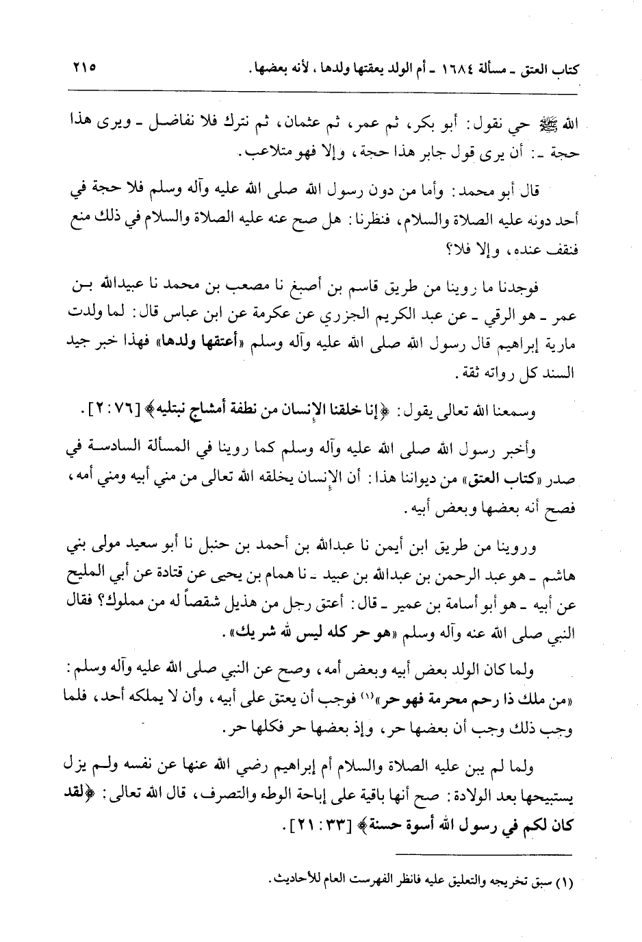 وَرُوِّينَا مِنْ طَرِيقِ ابْنِ أَيْمَنَ نا عَبْدُ اللَّهِ بْنُ أَحْمَدَ بْنِ حَنْبَلٍ نا أَبُو سَعِيدٍ مَوْلَى بَنِي هَاشِمٍ - هُوَ عَبْدُ الرَّحْمَنِ بْنُ عَبْدِ اللَّهِ بْنِ عُبَيْدٍ - نا هَمَّامُ بْنُ يَحْيَى عَنْ قَتَادَةَ عَنْ أَبِي الْمَلِيحِ عَنْ أَبِيهِ - هُوَ أَبُو أُسَامَةَ بْنُ عُمَيْرٍ - قَالَ: أَعْتَقَ رَجُلٌ مِنْ هُذَيْلٍ شِقْصًا لَهُ مِنْ مَمْلُوكٍ؟ فَقَالَ النَّبِيُّ - صَلَّى اللَّهُ عَلَيْهِ وَآلِهِ وَسَلَّمَ - «هُوَ حُرٌّ كُلُّهُ لَيْسَ لِلَّهِ شَرِيكٌ» . وَلَمَّا كَانَ الْوَلَدُ بَعْضَ أَبِيهِ وَبَعْضَ أُمِّهِ، وَصَحَّ عَنْ النَّبِيِّ - صَلَّى اللَّهُ عَلَيْهِ وَآلِهِ وَسَلَّمَ -: «مَنْ مَلَكَ ذَا رَحِمٍ مَحْرَمَةٍ فَهُوَ حُرٌّ» فَوَجَبَ أَنْ يُعْتَقَ عَلَى أَبِيهِ، وَأَنْ لَا يَمْلِكَهُ أَحَدٌ، فَلِمَا وَجَبَ ذَلِكَ وَجَبَ أَنَّ بَعْضَهَا حُرٌّ، وَإِذْ بَعْضُهَا حُرٌّ فَكُلُّهَا حُرٌّ. وَلَمَّا لَمْ يُبِنْ - عَلَيْهِ الصَّلَاةُ وَالسَّلَامُ - أُمَّ إبْرَاهِيمَ - رَضِيَ اللَّهُ عَنْهَا - عَنْ نَفْسِهِ وَلَمْ يَزَلْ يَسْتَبِيحُهَا بَعْدَ الْوِلَادَةِ صَحَّ أَنَّهَا بَاقِيَةٌ عَلَى إبَاحَةِ الْوَطْءِ وَالتَّصَرُّفِ، قَالَ اللَّهُ تَعَالَى {لَقَدْ كَانَ لَكُمْ فِي رَسُولِ اللَّهِ أُسْوَةٌ حَسَنَةٌ} [الأحزاب: 21] .