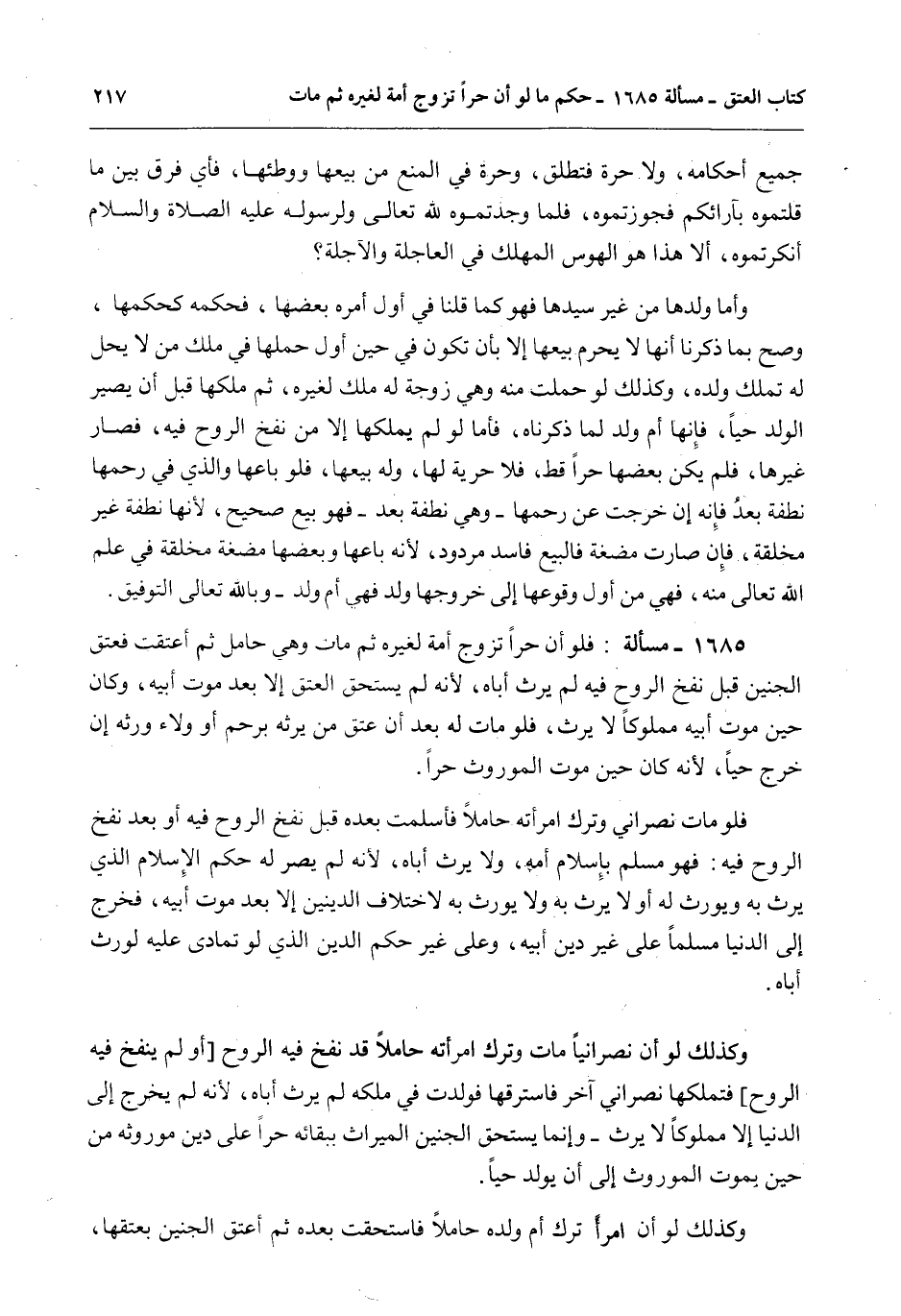 1685 - مَسْأَلَةٌ: فَلَوْ أَنَّ حُرًّا تَزَوَّجَ أَمَةً لِغَيْرِهِ ثُمَّ مَاتَ وَهِيَ حَامِلٌ ثُمَّ أُعْتِقَتْ فَعَتَقَ الْجَنِينُ قَبْلَ نَفْخِ الرُّوحِ فِيهِ لَمْ يَرِث أَبَاهُ؛ لِأَنَّهُ لَمْ يَسْتَحِقَّ الْعِتْقَ إلَّا بَعْدَ مَوْتِ أَبِيهِ، وَكَانَ حِينَ مَوْتِ أَبِيهِ مَمْلُوكًا لَا يَرِثُ، فَلَوْ مَاتَ لَهُ بَعْدَ أَنْ عَتَقَ مَنْ يَرِثُهُ بِرَحِمٍ أَوْ وَلَاءٍ وَرِثَهُ إنْ خَرَجَ حَيًّا؛ لِأَنَّهُ كَانَ حِينَ مَوْتِ الْمَوْرُوثِ حُرًّا.