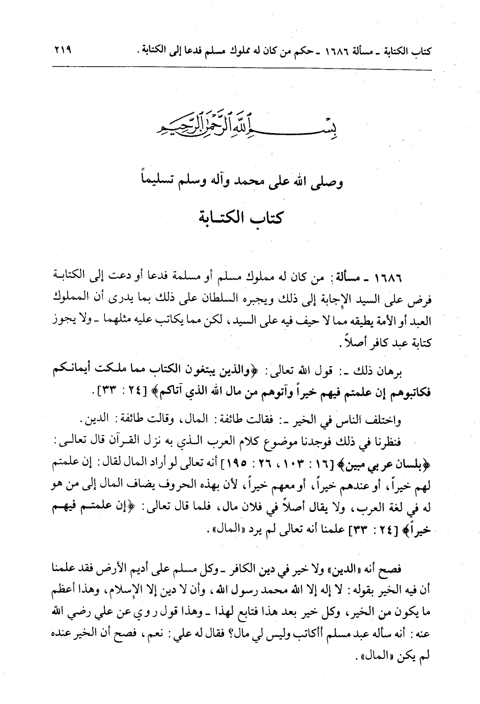 كِتَابُ الْكِتَابَةِ 1686 - مَسْأَلَةٌ: مَنْ كَانَ لَهُ مَمْلُوكٌ مُسْلِمٌ أَوْ مُسْلِمَةٌ فَدَعَا أَوْ دَعَتْ إلَى الْكِتَابَةِ فُرِضَ عَلَى السَّيِّدِ الْإِجَابَةُ إلَى ذَلِكَ وَيُجْبِرُهُ السُّلْطَانُ عَلَى ذَلِكَ بِمَا يُدْرَى أَنَّ الْمَمْلُوكَ الْعَبْدَ أَوْ الْأَمَةَ يُطِيقُهُ مِمَّا لَا حَيْفَ فِيهِ عَلَى السَّيِّدِ، لَكِنْ مِمَّا يُكَاتَبُ عَلَيْهِ مِثْلُهُمَا - وَلَا يَجُوزُ كِتَابَةُ عَبْدٍ كَافِرٍ أَصْلًا. بُرْهَانُ ذَلِكَ قَوْلُ اللَّهِ تَعَالَى {وَالَّذِينَ يَبْتَغُونَ الْكِتَابَ مِمَّا مَلَكَتْ أَيْمَانُكُمْ فَكَاتِبُوهُمْ إِنْ عَلِمْتُمْ فِيهِمْ خَيْرًا وَآتُوهُمْ مِنْ مَالِ اللَّهِ الَّذِي آتَاكُمْ} [النور: 33] . وَاخْتَلَفَ النَّاسُ فِي الْخَيْرِ. فَقَالَتْ طَائِفَةٌ: الْمَالُ، وَقَالَتْ طَائِفَةٌ: الدِّينُ. فَنَظَرْنَا فِي ذَلِكَ فَوَجَدْنَا مَوْضُوعَ كَلَامِ الْعَرَبِ الَّذِي بِهِ نَزَلَ الْقُرْآنُ قَالَ تَعَالَى: {بِلِسَانٍ عَرَبِيٍّ مُبِينٍ} [الشعراء: 195] أَنَّهُ تَعَالَى لَوْ أَرَادَ الْمَالَ لَقَالَ: إنْ عَلِمْتُمْ لَهُمْ خَيْرًا، أَوْ عِنْدَهُمْ خَيْرًا، أَوْ مَعَهُمْ خَيْرًا، لِأَنَّ بِهَذِهِ الْحُرُوفِ يُضَافُ الْمَالُ إلَى مَنْ هُوَ لَهُ فِي لُغَةِ الْعَرَبِ، وَلَا يُقَالُ أَصْلًا فِي فُلَانٍ مَالٌ، فَلَمَّا قَالَ تَعَالَى: {إِنْ عَلِمْتُمْ فِيهِمْ خَيْرًا} [النور: 33] عَلِمْنَا أَنَّهُ تَعَالَى لَمْ يَرِدْ " الْمَالَ "، فَصَحَّ أَنَّهُ " الدِّينُ " وَلَا خَيْرَ فِي دِينِ الْكَافِرِ - وَكُلُّ مُسْلِمٍ عَلَى أَدِيمِ الْأَرْضِ فَقَدْ عَلِمْنَا أَنَّ فِيهِ الْخَيْرَ بِقَوْلِهِ: لَا إلَهَ إلَّا اللَّهُ مُحَمَّدٌ رَسُولُ اللَّهِ، وَأَنْ لَا دِينَ إلَّا الْإِسْلَامُ، وَهَذَا أَعْظَمُ مَا يَكُونُ مِنْ الْخَيْرِ، وَكُلُّ خَيْرٍ بَعْدَ هَذَا فَتَابِعٌ لِهَذَا - وَهَذَا قَوْلٌ رُوِيَ عَنْ عَلِيٍّ - رَضِيَ اللَّهُ عَنْهُ -: أَنَّهُ سَأَلَهُ عَبْدٌ مُسْلِمٌ أَأُكَاتِبُ وَلَيْسَ لِي مَالٌ؟ فَقَالَ لَهُ عَلِيٌّ: نَعَمْ، فَصَحَّ أَنَّ الْخَيْرَ عِنْدَهُ لَمْ يَكُنْ " الْمَالَ ".