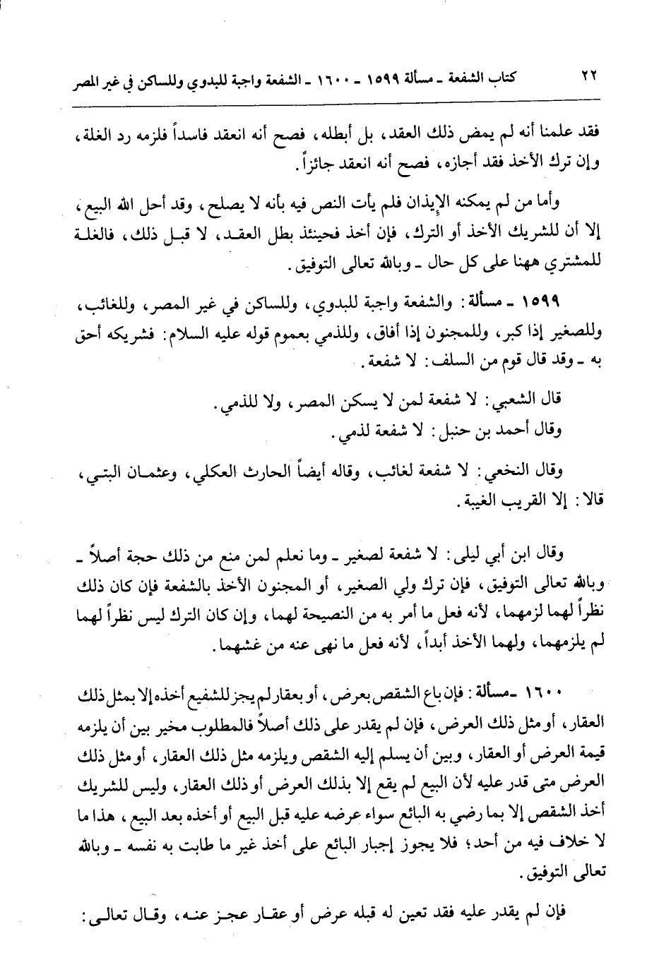 1599 - مَسْأَلَةٌ: وَالشُّفْعَةُ وَاجِبَةٌ لِلْبَدْوِيِّ، وَلِلسَّاكِنِ فِي غَيْرِ الْمِصْرِ، وَلِلْغَائِبِ، وَلِلصَّغِيرِ إذَا كَبُرَ، وَلِلْمَجْنُونِ إذَا أَفَاقَ، وَلِلذِّمِّيِّ بِعُمُومِ قَوْلِهِ - عَلَيْهِ السَّلَامُ -: «فَشَرِيكُهُ أَحَقُّ بِهِ» وَقَدْ قَالَ قَوْمٌ مِنْ السَّلَفِ: لَا شُفْعَةَ.