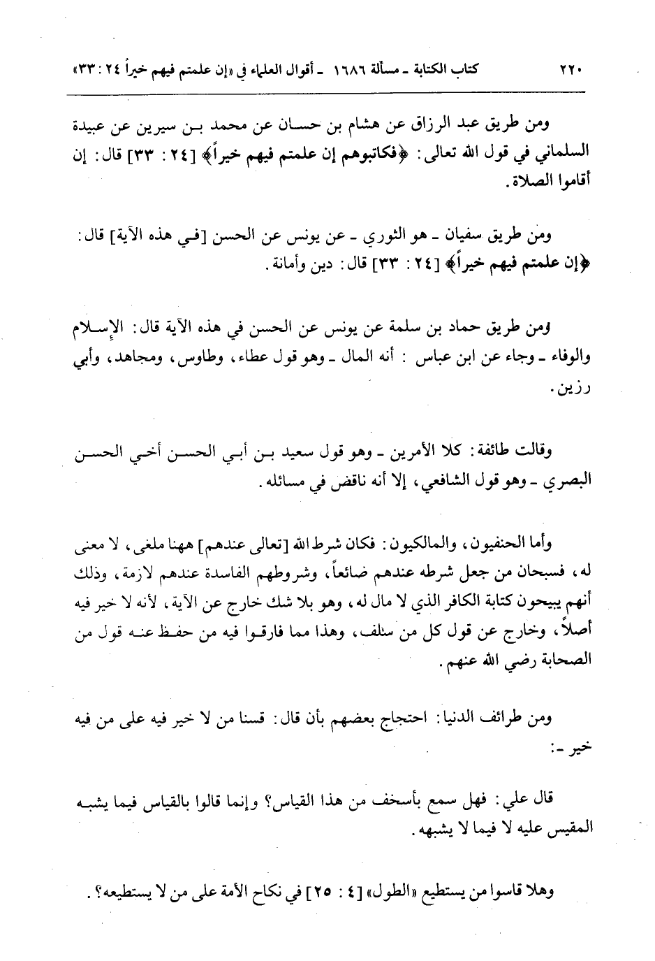 وَمِنْ طَرِيقِ عَبْدِ الرَّزَّاقِ عَنْ هِشَامِ بْنِ حَسَّانَ عَنْ مُحَمَّدِ بْنِ سِيرِينَ عَنْ عَبِيدَةَ السَّلْمَانِيِّ فِي قَوْلِ اللَّهِ تَعَالَى: {فَكَاتِبُوهُمْ إِنْ عَلِمْتُمْ فِيهِمْ خَيْرًا} [النور: 33] قَالَ: إنْ أَقَامُوا الصَّلَاةَ. وَمِنْ طَرِيقِ سُفْيَانَ - هُوَ الثَّوْرِيُّ - عَنْ يُونُسَ عَنْ الْحَسَنِ قَالَ: {إِنْ عَلِمْتُمْ فِيهِمْ خَيْرًا} [النور: 33] قَالَ: دِينٌ وَأَمَانَةٌ. وَمِنْ طَرِيقِ حَمَّادِ بْنِ سَلَمَةَ عَنْ يُونُسَ عَنْ الْحَسَنِ فِي هَذِهِ الْآيَةِ قَالَ: الْإِسْلَامُ وَالْوَفَاءُ - وَجَاءَ عَنْ ابْنِ عَبَّاسٍ: أَنَّهُ الْمَالُ - وَهُوَ قَوْلُ عَطَاءٍ، وَطَاوُسٍ، وَمُجَاهِدٍ، وَأَبِي رَزِينٍ.