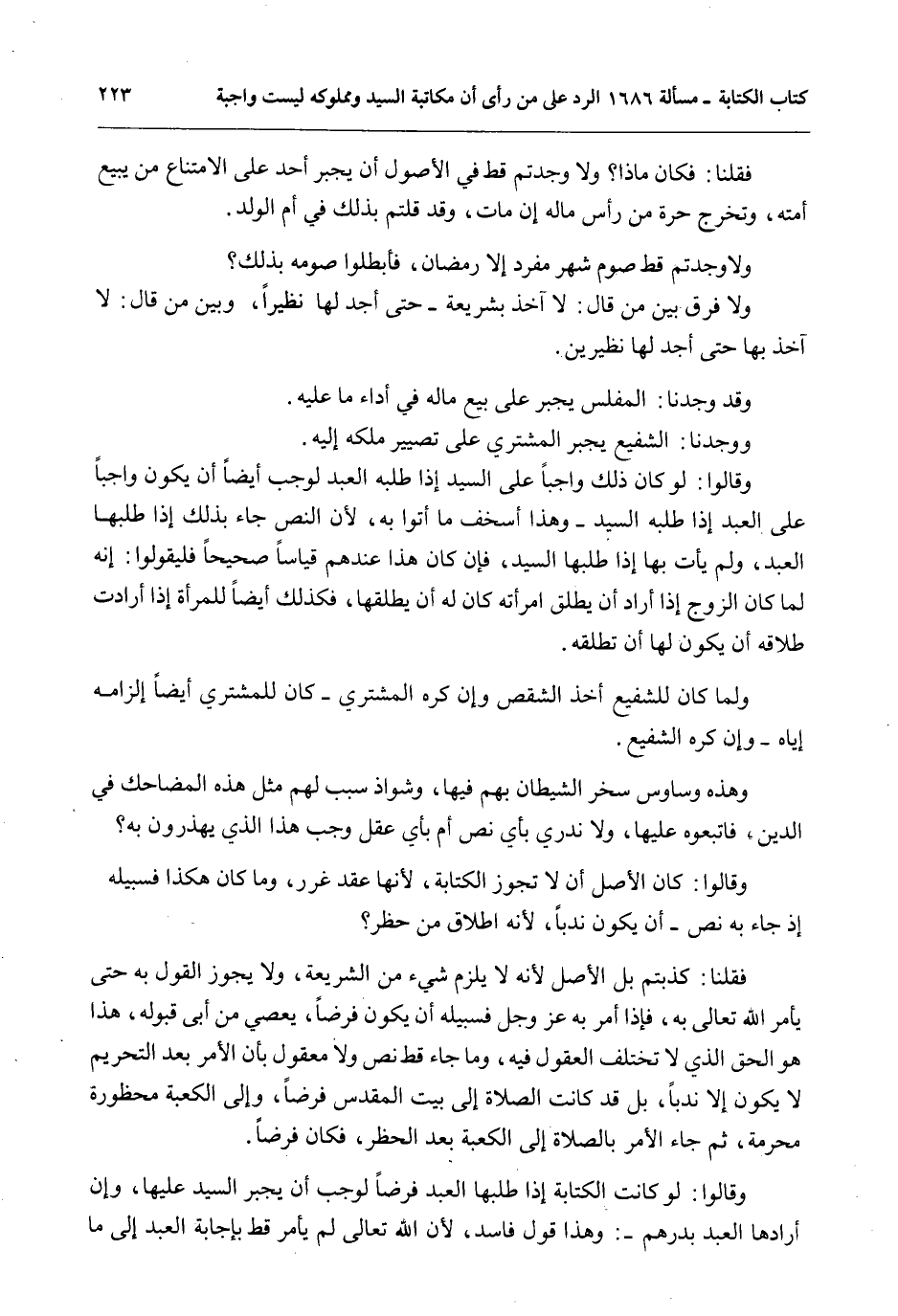 وَقَدْ وَجَدْنَا: الْمُفْلِسَ يُجْبَرُ عَلَى بَيْعِ مَالِهِ فِي أَدَاءِ مَا عَلَيْهِ. وَوَجَدْنَا: الشَّفِيعَ يُجْبِرُ الْمُشْتَرِيَ عَلَى تَصْيِيرِ مِلْكِهِ إلَيْهِ. وَقَالُوا: لَوْ كَانَ ذَلِكَ وَاجِبًا عَلَى السَّيِّدِ إذَا طَلَبَهُ الْعَبْدُ لَوَجَبَ أَيْضًا أَنْ يَكُونَ وَاجِبًا عَلَى الْعَبْدِ إذَا طَلَبَهُ السَّيِّدُ - وَهَذَا أَسْخَفُ مَا أَتَوْا بِهِ؛ لِأَنَّ النَّصَّ جَاءَ بِذَلِكَ إذَا طَلَبَهَا الْعَبْدُ، وَلَمْ يَأْتِ بِهَا إذَا طَلَبَهَا السَّيِّدُ، فَإِنْ كَانَ هَذَا عِنْدَهُمْ قِيَاسًا صَحِيحًا فَلْيَقُولُوا: إنَّهُ لَمَّا كَانَ الزَّوْجُ إذَا أَرَادَ أَنْ يُطَلِّقَ امْرَأَتَهُ كَانَ لَهُ أَنْ يُطَلِّقَهَا، فَكَذَلِكَ أَيْضًا لِلْمَرْأَةِ إذَا أَرَادَتْ طَلَاقَهُ أَنْ يَكُونَ لَهَا أَنْ تُطَلِّقَهُ. وَلَمَّا كَانَ لِلشَّفِيعِ أَخْذُ الشِّقْصِ وَإِنْ كَرِهَ الْمُشْتَرِي - كَانَ لِلْمُشْتَرِي أَيْضًا إلْزَامُهُ إيَّاهُ - وَإِنْ كَرِهَ الشَّفِيعُ. وَهَذِهِ وَسَاوِسُ سَخِرَ الشَّيْطَانُ بِهِمْ فِيهَا، وَشَوَاذُّ سَبَّبَ لَهُمْ مِثْلَ هَذِهِ الْمَضَاحِكِ فِي الدِّينِ، فَاتَّبَعُوهُ عَلَيْهَا، وَلَا نَدْرِي بِأَيِّ نَصٍّ أَمْ بِأَيِّ عَقْلٍ وَجَبَ هَذَا الَّذِي يَهْذِرُونَ بِهِ؟ وَقَالُوا: كَانَ الْأَصْلُ أَنْ لَا تَجُوزَ الْكِتَابَةُ؛ لِأَنَّهَا عَقْدُ غَرَرٍ، وَمَا كَانَ هَكَذَا فَسَبِيلُهُ إذْ جَاءَ بِهِ نَصٌّ - أَنْ يَكُونَ نَدْبًا؛ لِأَنَّهُ إطْلَاقٌ مِنْ حَظْرٍ؟ فَقُلْنَا: كَذَبْتُمْ بَلْ الْأَصْلُ لِأَنَّهُ لَا يَلْزَمُ شَيْءٌ مِنْ الشَّرِيعَةِ، وَلَا يَجُوزُ الْقَوْلُ بِهِ حَتَّى يَأْمُرَ اللَّهُ تَعَالَى بِهِ، فَإِذَا أَمَرَ بِهِ عَزَّ وَجَلَّ فَسَبِيلُهُ أَنْ يَكُونَ فَرْضًا، يَعْصِي مَنْ أَبَى قَبُولَهُ، هَذَا هُوَ الْحَقُّ الَّذِي لَا تَخْتَلِفُ الْعُقُولُ فِيهِ، وَمَا جَاءَ قَطُّ نَصٌّ وَلَا مَعْقُولٌ بِأَنَّ الْأَمْرَ بَعْدَ التَّحْرِيمِ لَا يَكُونُ إلَّا نَدْبًا، بَلْ قَدْ كَانَتْ الصَّلَاةُ إلَى بَيْتِ الْمَقْدِسِ فَرْضًا، وَإِلَى الْكَعْبَةِ مَحْظُورَةً مُحَرَّمَةً، ثُمَّ جَاءَ الْأَمْرُ بِالصَّلَاةِ إلَى الْكَعْبَةِ بَعْدَ الْحَظْرِ، فَكَانَ فَرْضًا.