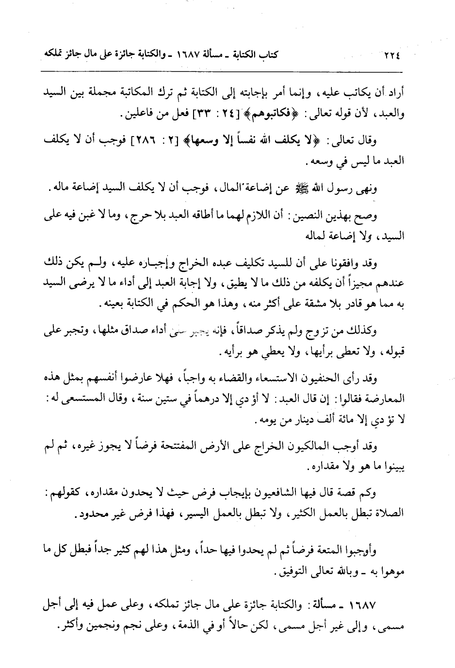 أَرَادَ أَنْ يُكَاتَبَ عَلَيْهِ، وَإِنَّمَا أُمِرَ بِإِجَابَتِهِ إلَى الْكِتَابَةِ ثُمَّ تَرَكَ الْمُكَاتَبَةَ مُجْمَلَةً بَيْنَ السَّيِّدِ وَالْعَبْدِ؛ لِأَنَّ قَوْله تَعَالَى: {فَكَاتِبُوهُمْ} [النور: 33] فِعْلٌ مِنْ فَاعِلَيْنِ، وَقَالَ تَعَالَى {لا يُكَلِّفُ اللَّهُ نَفْسًا إِلا وُسْعَهَا} [البقرة: 286] فَوَجَبَ أَنْ لَا يُكَلِّفَ الْعَبْدَ مَا لَيْسَ فِي وُسْعِهِ. وَنَهَى رَسُولُ اللَّهِ - صَلَّى اللَّهُ عَلَيْهِ وَسَلَّمَ - عَنْ إضَاعَةِ الْمَالِ، فَوَجَبَ أَنْ لَا يُكَلِّفَ السَّيِّدَ إضَاعَةَ مَالِهِ. وَصَحَّ بِهَذَيْنِ النَّصَّيْنِ: أَنَّ اللَّازِمَ لَهُمَا مَا أَطَاقَهُ الْعَبْدُ بِلَا حَرَجٍ، وَمَا لَا غَبْنَ فِيهِ عَلَى السَّيِّدِ، وَلَا إضَاعَةَ لِمَالِهِ وَقَدْ وَافَقُونَا عَلَى أَنَّ لِلسَّيِّدِ تَكْلِيفَ عَبْدِهِ الْخَرَاجَ وَإِجْبَارَهُ عَلَيْهِ، وَلَمْ يَكُنْ ذَلِكَ عِنْدَهُمْ مُجِيزًا أَنْ يُكَلِّفَهُ مِنْ ذَلِكَ مَا لَا يُطِيقُ، وَلَا إجَابَةُ الْعَبْدِ إلَى أَدَاءِ مَا لَا يَرْضَى السَّيِّدُ بِهِ مِمَّا هُوَ قَادِرٌ بِلَا مَشَقَّةٍ عَلَى أَكْثَرَ مِنْهُ، وَهَذَا هُوَ الْحُكْمُ فِي الْكِتَابَةِ بِعَيْنِهِ وَكَذَلِكَ مَنْ تَزَوَّجَ وَلَمْ يَذْكُرْ صَدَاقًا، فَإِنَّهُ يُجْبَرُ عَلَى أَدَاءِ صَدَاقِ مِثْلِهَا، وَتُجْبَرُ عَلَى قَبُولِهِ، وَلَا تُعْطَى بِرَأْيِهَا، وَلَا يُعْطِي هُوَ بِرَأْيِهِ. وَقَدْ رَأَى الْحَنَفِيُّونَ الِاسْتِسْعَاءَ وَالْقَضَاءَ بِهِ وَاجِبًا، فَهَلَّا عَارَضُوا أَنْفُسَهُمْ بِمِثْلِ هَذِهِ الْمُعَارَضَةِ فَقَالُوا: إنْ قَالَ الْعَبْدُ: لَا أُؤَدِّي إلَّا دِرْهَمًا فِي سِتِّينَ سَنَةٍ، وَقَالَ الْمُسْتَسْعَى لَهُ: لَا تُؤَدِّي إلَّا مِائَةَ أَلْفِ دِينَارٍ مِنْ يَوْمِهِ.