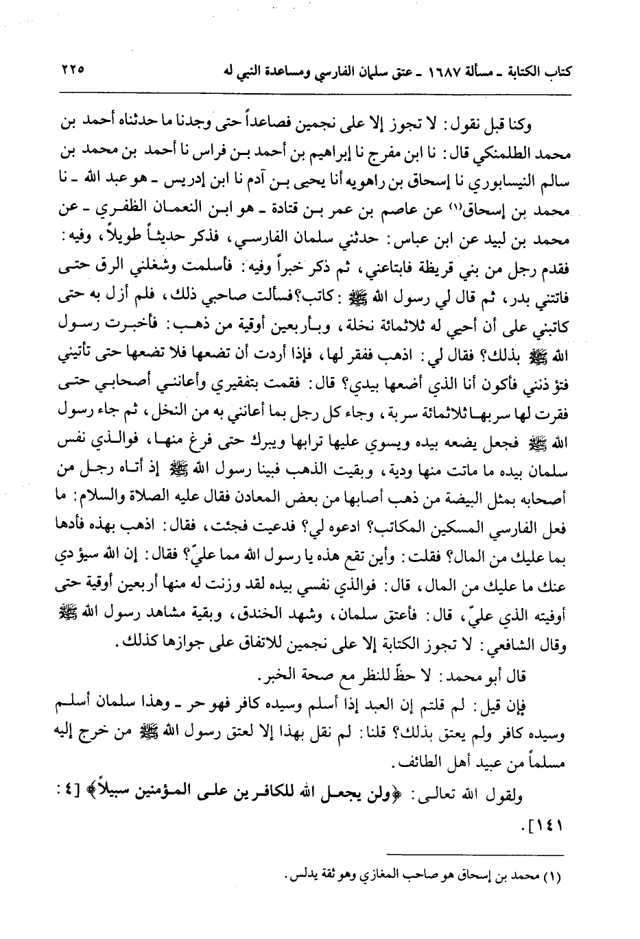 وَكُنَّا قَبْلُ نَقُولُ: لَا تَجُوزُ إلَّا عَلَى نَجْمَيْنِ فَصَاعِدًا حَتَّى وَجَدْنَا مَا حَدَّثَنَاهُ أَحْمَدُ بْنُ مُحَمَّدٍ الطَّلْمَنْكِيُّ قَالَ: نا ابْنُ مُفَرِّجٍ نا إبْرَاهِيمُ بْنُ أَحْمَدَ بْنِ فِرَاسٍ نا أَحْمَدُ بْنُ مُحَمَّدِ بْنِ سَالِمٍ النَّيْسَابُورِيُّ نا إِسْحَاقُ بْنُ رَاهْوَيْهِ نا يَحْيَى بْنُ آدَمَ نا ابْنُ إدْرِيسَ - هُوَ عَبْدُ اللَّهِ - نا مُحَمَّدُ بْنُ إِسْحَاقَ عَنْ عَاصِمِ بْنِ عُمَرَ بْنِ قَتَادَةَ - هُوَ ابْنُ النُّعْمَانَ الظَّفَرِيُّ - عَنْ مُحَمَّدِ بْنِ لَبِيدٍ عَنْ ابْنِ عَبَّاسٍ: «حَدَّثَنِي سَلْمَانُ الْفَارِسِيُّ، فَذَكَرَ حَدِيثًا طَوِيلًا، وَفِيهِ: فَقَدِمَ رَجُلٌ مِنْ بَنِي قُرَيْظَةَ فَابْتَاعَنِي، ثُمَّ ذَكَرَ خَبَرًا وَفِيهِ: فَأَسْلَمْتُ وَشَغَلَنِي الرِّقُّ حَتَّى فَاتَتْنِي بَدْرٌ، ثُمَّ قَالَ لِي رَسُولُ اللَّهِ - صَلَّى اللَّهُ عَلَيْهِ وَسَلَّمَ -: كَاتِبْ؟ فَسَأَلْتُ صَاحِبِي ذَلِكَ، فَلَمْ أَزَلْ بِهِ حَتَّى كَاتَبَنِي عَلَى أَنْ أُحْيِيَ لَهُ ثَلَاثَمِائَةِ نَخْلَةٍ، وَبِأَرْبَعِينَ أُوقِيَّةً مِنْ ذَهَبٍ: فَأَخْبَرْتُ رَسُولَ اللَّهِ - صَلَّى اللَّهُ عَلَيْهِ وَسَلَّمَ - بِذَلِكَ؟ فَقَالَ لِي: اذْهَبْ فَفَقِّرْ لَهَا، فَإِذَا أَرَدْتَ أَنْ تَضَعَهَا فَلَا تَضَعْهَا حَتَّى تَأْتِيَنِي فَتُؤْذِنَنِي فَأَكُونَ أَنَا الَّذِي أَضَعُهَا بِيَدِي؟ قَالَ: فَقُمْت بِتَفْقِيرِي وَأَعَانَنِي أَصْحَابِي حَتَّى فَقَرْتُ لَهَا سَرَبَهَا ثَلَاثَمِائَةِ سَرْبَةٍ، وَجَاءَ كُلُّ رَجُلٍ بِمَا أَعَانَنِي بِهِ مِنْ النَّخْلِ، ثُمَّ جَاءَ رَسُولُ اللَّهِ - صَلَّى اللَّهُ عَلَيْهِ وَسَلَّمَ - فَجَعَلَ يَضَعُهُ بِيَدِهِ وَيُسَوِّي عَلَيْهَا تُرَابَهَا وَيُبَرِّكُ حَتَّى فَرَغَ مِنْهَا، فَوَاَلَّذِي نَفْسُ سَلْمَانَ بِيَدِهِ مَا مَاتَتْ مِنْهَا وَدِيَةٌ، وَبَقِيَتْ الذَّهَبُ فَبَيْنَا رَسُولُ اللَّهِ - صَلَّى اللَّهُ عَلَيْهِ وَسَلَّمَ - إذْ أَتَاهُ رَجُلٌ مِنْ أَصْحَابِهِ بِمِثْلِ الْبَيْضَةِ مِنْ ذَهَبٍ أَصَابَهَا مِنْ بَعْضِ الْمَعَادِنِ فَقَالَ - عَلَيْهِ الصَّلَاةُ وَالسَّلَامُ -: مَا فَعَلَ الْفَارِسِيُّ الْمِسْكِينُ الْمُكَاتَبُ؟ اُدْعُوهُ لِي؟ فَدُعِيتُ فَجِئْتُ، فَقَالَ: اذْهَبْ بِهَذِهِ فَأَدِّهَا بِمَا عَلَيْكَ مِنْ الْمَالِ؟ فَقُلْتُ: وَأَيْنَ تَقَعُ هَذِهِ يَا رَسُولَ اللَّهِ مِمَّا عَلَيَّ؟ فَقَالَ: إنَّ اللَّهَ سَيُؤَدِّي عَنْكَ مَا عَلَيْكَ مِنْ الْمَالِ، قَالَ: فَوَاَلَّذِي نَفْسِي بِيَدِهِ لَقَدْ وَزَنْتُ لَهُ مِنْهَا أَرْبَعِينَ أُوقِيَّةً حَتَّى أَوْفَيْتُهُ الَّذِي عَلَيَّ، قَالَ: فَأُعْتِقَ سَلْمَانُ، وَشَهِدَ الْخَنْدَقَ، وَبَقِيَّةَ مَشَاهِدِ رَسُولِ اللَّهِ - صَلَّى اللَّهُ عَلَيْهِ وَسَلَّمَ -» وَقَالَ الشَّافِعِيُّ: لَا تَجُوزُ الْكِتَابَةُ إلَّا عَلَى نَجْمَيْنِ لِلِاتِّفَاقِ عَلَى جَوَازِهَا كَذَلِكَ. قَالَ أَبُو مُحَمَّدٍ: لَا حَظَّ لِلنَّظَرِ مَعَ صِحَّةِ الْخَبَرِ. فَإِنْ قِيلَ: لِمَ قُلْتُمْ إنَّ الْعَبْدَ إذَا أَسْلَمَ وَسَيِّدُهُ كَافِرٌ فَهُوَ حُرٌّ - وَهَذَا سَلْمَانُ أَسْلَمَ وَسَيِّدُهُ كَافِرٌ وَلَمْ يُعْتَقْ بِذَلِكَ؟ قُلْنَا: لَمْ نَقُلْ بِهَذَا إلَّا لِعِتْقِ رَسُولِ اللَّهِ - صَلَّى اللَّهُ عَلَيْهِ وَسَلَّمَ - مَنْ خَرَجَ إلَيْهِ مُسْلِمًا مِنْ عَبِيدِ أَهْلِ الطَّائِفِ. وَلِقَوْلِ اللَّهِ تَعَالَى: {وَلَنْ يَجْعَلَ اللَّهُ لِلْكَافِرِينَ عَلَى الْمُؤْمِنِينَ سَبِيلا} [النساء: 141]