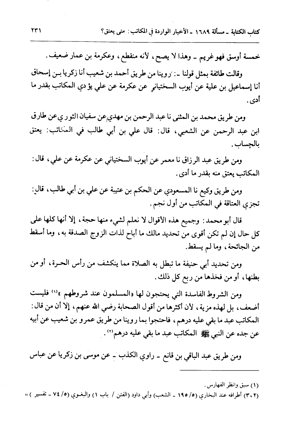 وَمِنْ طَرِيقِ مُحَمَّدِ بْنِ الْمُثَنَّى نا عَبْدُ الرَّحْمَنِ بْنُ مَهْدِيٍّ عَنْ سُفْيَانَ الثَّوْرِيِّ عَنْ طَارِقِ بْنِ عَبْدِ الرَّحْمَنِ عَنْ الشَّعْبِيِّ، قَالَ: قَالَ عَلِيُّ بْنُ أَبِي طَالِبٍ فِي الْمُكَاتَبِ: يُعْتَقُ بِالْحِسَابِ. وَمِنْ طَرِيقِ عَبْدِ الرَّزَّاقِ نا مَعْمَرٌ عَنْ أَيُّوبَ السِّخْتِيَانِيِّ عَنْ عِكْرِمَةَ عَنْ عَلِيٍّ، قَالَ: الْمُكَاتَبُ يُعْتَقُ مِنْهُ بِقَدْرِ مَا أَدَّى. وَمِنْ طَرِيقِ وَكِيعٍ نا الْمَسْعُودِيُّ عَنْ الْحَكَمِ بْنِ عُتَيْبَةَ عَنْ عَلِيِّ بْنِ أَبِي طَالِبٍ، قَالَ: تُجْزِي الْعَتَاقَةُ فِي الْمُكَاتَبِ مِنْ أَوَّلِ نَجْمٍ. قَالَ أَبُو مُحَمَّدٍ: وَجَمِيعُ هَذِهِ الْأَقْوَالِ لَا نَعْلَمُ لِشَيْءٍ مِنْهَا حُجَّةً، إلَّا أَنَّهَا كُلَّهَا عَلَى كُلِّ حَالٍ إنْ لَمْ تَكُنْ أَقْوَى مِنْ تَحْدِيدِ مَالِكٍ مَا أَبَاحَ لِذَاتِ الزَّوْجِ الصَّدَقَةَ بِهِ، وَمَا أَسْقَطَ مِنْ الْجَائِحَةِ، وَمَا لَمْ يُسْقِطْ. وَمِنْ تَحْدِيدِ أَبِي حَنِيفَةَ مَا تَبْطُلُ بِهِ الصَّلَاةُ مِمَّا يَنْكَشِفُ مِنْ رَأْسِ الْحُرَّةِ، أَوْ مِنْ بَطْنِهَا، أَوْ مِنْ فَخِذِهَا مِنْ رُبُعِ كُلِّ ذَلِكَ. وَمِنْ الشُّرُوطِ الْفَاسِدَةِ الَّتِي يَحْتَجُّونَ لَهَا " الْمُسْلِمُونَ عِنْدَ شُرُوطِهِمْ " فَلَيْسَتْ أَضْعَفَ، بَلْ لِهَذِهِ مَزِيَّةٌ؛ لِأَنَّ أَكْثَرَهَا مِنْ أَقْوَالِ الصَّحَابَةِ - رَضِيَ اللَّهُ عَنْهُمْ -، إلَّا أَنَّ مَنْ قَالَ: الْمُكَاتَبُ عَبْدٌ مَا بَقِيَ عَلَيْهِ دِرْهَمٌ، فَاحْتَجُّوا بِمَا رُوِّينَا مِنْ طَرِيقِ عَمْرِو بْنِ شُعَيْبٍ عَنْ أَبِيهِ عَنْ جَدِّهِ عَنْ النَّبِيِّ - صَلَّى اللَّهُ عَلَيْهِ وَسَلَّمَ - «الْمُكَاتَبُ عَبْدٌ مَا بَقِيَ عَلَيْهِ دِرْهَمٌ» . وَمِنْ طَرِيقِ عَبْدِ الْبَاقِي بْنِ قَانِعٍ - رَاوِي الْكَذِبِ - عَنْ مُوسَى بْنِ زَكَرِيَّا عَنْ عَبَّاسِ بْنِ مُحَمَّدٍ