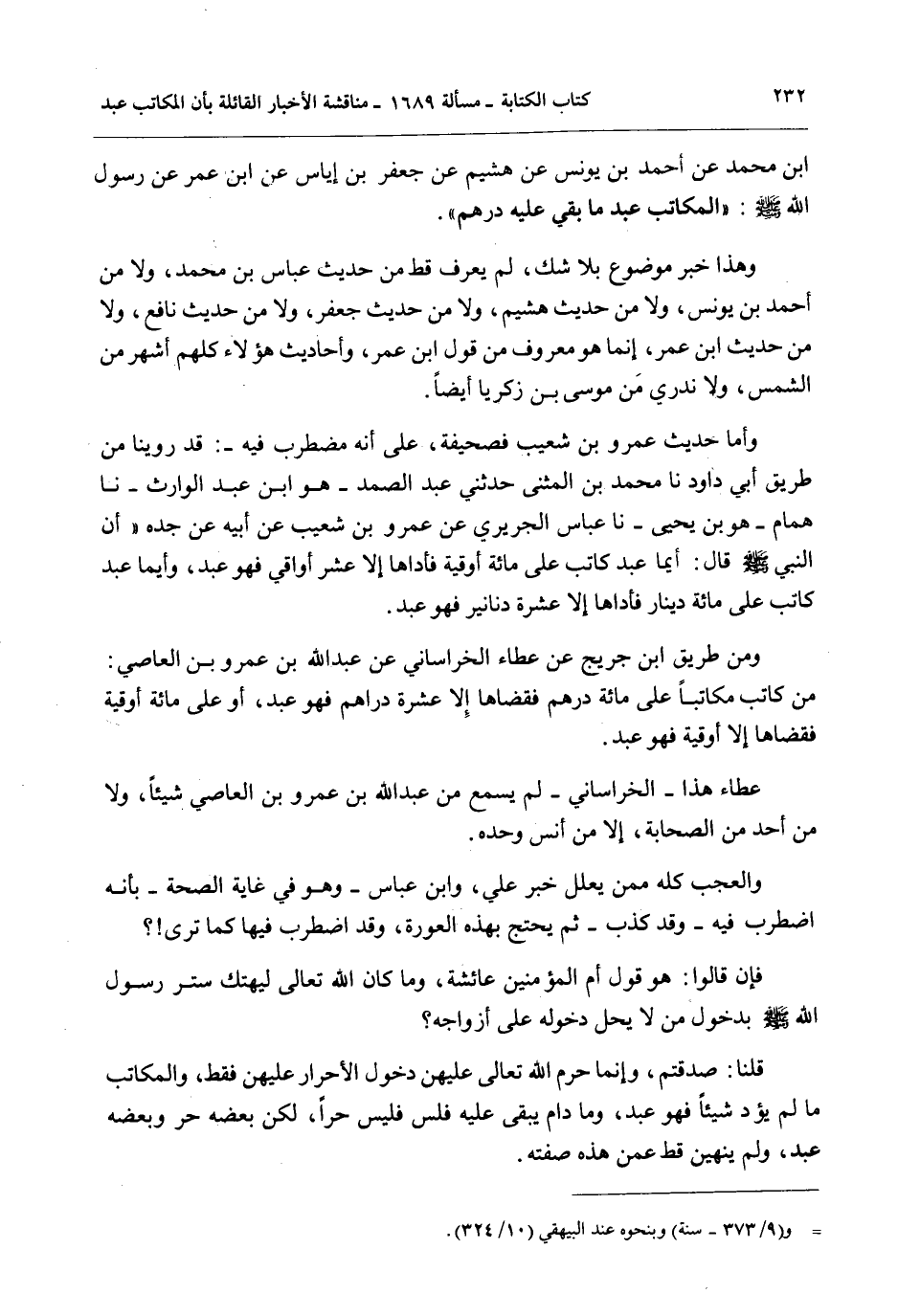 عَنْ أَحْمَدَ بْنَ يُونُسَ عَنْ هُشَيْمٍ عَنْ جَعْفَرِ بْنِ إيَاسٍ عَنْ ابْنِ عُمَرَ عَنْ رَسُولِ اللَّهِ - صَلَّى اللَّهُ عَلَيْهِ وَسَلَّمَ -: «الْمُكَاتَبُ عَبْدٌ مَا بَقِيَ عَلَيْهِ دِرْهَمٌ» . وَهَذَا خَبَرٌ مَوْضُوعٌ بِلَا شَكٍّ، لَمْ يُعْرَفْ قَطُّ مِنْ حَدِيثِ عَبَّاسِ بْنِ مُحَمَّدٍ، وَلَا مِنْ أَحْمَدَ بْنَ يُونُسَ، وَلَا مِنْ حَدِيثِ هُشَيْمٍ، وَلَا مِنْ حَدِيثِ جَعْفَرٍ، وَلَا مِنْ حَدِيثِ نَافِعٍ، وَلَا مِنْ حَدِيثِ ابْنِ عُمَرَ، إنَّمَا هُوَ مَعْرُوفٌ مِنْ قَوْلِ ابْنِ عُمَرَ، وَأَحَادِيثُ هَؤُلَاءِ كُلُّهُمْ أَشْهَرُ مِنْ الشَّمْسِ، وَلَا نَدْرِي مَنْ مُوسَى بْنُ زَكَرِيَّا أَيْضًا. وَأَمَّا حَدِيثُ عَمْرِو بْنِ شُعَيْبٍ فَصَحِيفَةٌ، عَلَى أَنَّهُ مُضْطَرِبٌ فِيهِ. قَدْ رُوِّينَا مِنْ طَرِيقِ أَبِي دَاوُد نا مُحَمَّدُ بْنُ الْمُثَنَّى حَدَّثَنِي عَبْدُ الصَّمَدِ - هُوَ ابْنُ عَبْدِ الْوَارِثِ - نا هَمَّامٌ - هُوَ ابْنُ يَحْيَى - نا عَبَّاسٌ الْجُرَيْرِيُّ عَنْ عَمْرِو بْنِ شُعَيْبٍ عَنْ أَبِيهِ عَنْ جَدِّهِ " أَنَّ النَّبِيَّ - صَلَّى اللَّهُ عَلَيْهِ وَسَلَّمَ - قَالَ: «أَيُّمَا عَبْدٍ كَاتَبَ عَلَى مِائَةِ أُوقِيَّةٍ فَأَدَّاهَا إلَّا عَشْرَ أَوَاقٍ فَهُوَ عَبْدٌ، وَأَيُّمَا عَبْدٌ كَاتَبَ عَلَى مِائَةِ دِينَارٍ فَأَدَّاهَا إلَّا عَشَرَةَ دَنَانِيرَ فَهُوَ عَبْدٌ» .