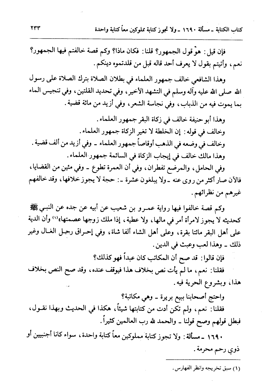 1690 - مَسْأَلَةٌ: وَلَا تَجُوزُ كِتَابَةُ مَمْلُوكَيْنِ مَعًا كِتَابَةً وَاحِدَةً، سَوَاءٌ كَانَا أَجْنَبِيَّيْنِ أَوْ ذَوَيْ رَحِمٍ مَحْرَمَةٍ.