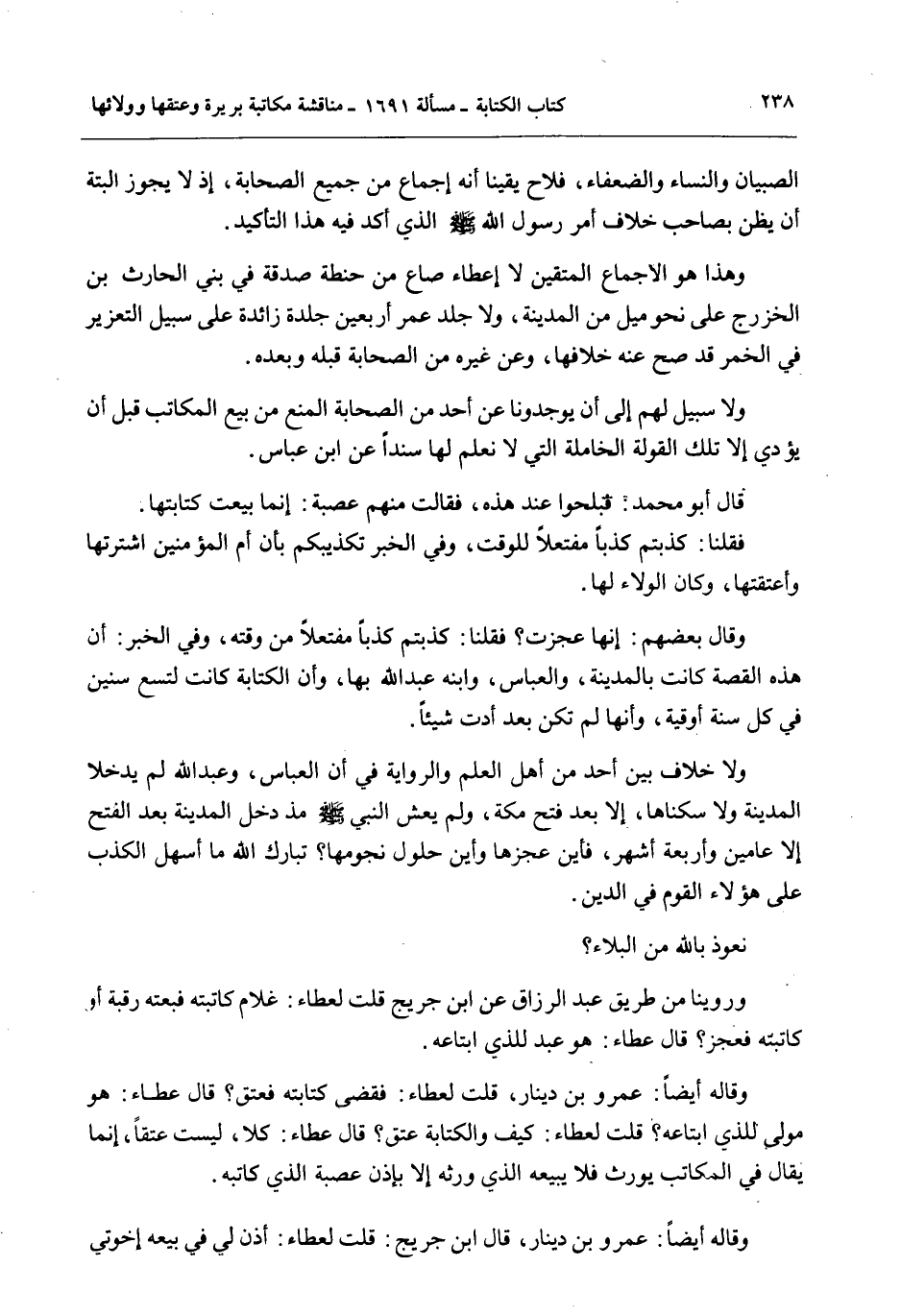 وَرُوِّينَا مِنْ طَرِيقِ عَبْدِ الرَّزَّاقِ عَنْ ابْنِ جُرَيْجٍ قُلْت لِعَطَاءٍ: غُلَامٌ كَاتَبْتَهُ فَبِعْته رَقَبَةً أَوْ كَاتَبْته فَعَجَزَ؟ قَالَ عَطَاءٌ: هُوَ عَبْدٌ لِلَّذِي ابْتَاعَهُ. وَقَالَهُ أَيْضًا: عَمْرُو بْنُ دِينَارٍ، قُلْت لِعَطَاءٍ: فَقَضَى كِتَابَتَهُ فَعَتَقَ؟ قَالَ عَطَاءٌ: هُوَ مَوْلَى لِلَّذِي ابْتَاعَهُ؟ قُلْت لِعَطَاءٍ: كَيْفَ وَالْكِتَابَةُ عِتْقٌ؟ قَالَ عَطَاءٌ: كَلًّا، لَيْسَتْ عِتْقًا، إنَّمَا يُقَالُ فِي الْمُكَاتَبِ يُورَثُ فَلَا يَبِيعُهُ الَّذِي وَرِثَهُ إلَّا بِإِذْنِ عَصَبَةِ الَّذِي كَاتَبَهُ. وَقَالَهُ أَيْضًا: عَمْرُو بْنُ دِينَارٍ، قَالَ ابْنُ جُرَيْجٍ: قُلْت لِعَطَاءٍ: أَذِنَ لِي فِي بَيْعِهِ إخْوَتِي