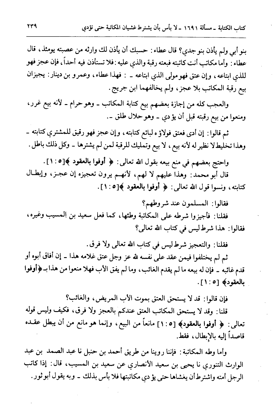 وَاحْتَجَّ بَعْضُهُمْ فِي مَنْعِ بَيْعِهِ بِقَوْلِ اللَّهِ تَعَالَى {أَوْفُوا بِالْعُقُودِ} [المائدة: 1] . قَالَ أَبُو مُحَمَّدٍ: وَهَذَا عَلَيْهِمْ لَا لَهُمْ؛ لِأَنَّهُمْ يَرَوْنَ تَعْجِيزَهُ إنْ عَجَزَ، وَإِبْطَالَ كِتَابَتِهِ، وَنَسَوْا قَوْلَ اللَّهِ تَعَالَى {أَوْفُوا بِالْعُقُودِ} [المائدة: 1] . فَقَالُوا: الْمُسْلِمُونَ عِنْدَ شُرُوطِهِمْ؟ فَقُلْنَا: فَأَجِيزُوا شَرْطَهُ عَلَى الْمُكَاتَبَةِ وَطِئَهَا، كَمَا فَعَلَ سَعِيدُ بْنُ الْمُسَيِّبِ وَغَيْرُهُ، فَقَالُوا: هَذَا شَرْطٌ لَيْسَ فِي كِتَابِ اللَّهِ تَعَالَى؟ فَقُلْنَا: وَالتَّعْجِيزُ شَرْطٌ لَيْسَ فِي كِتَابِ اللَّهِ تَعَالَى وَلَا فَرْقَ. ثُمَّ لَمْ يَخْتَلِفُوا فِيمَنْ عَقَدَ عَلَى نَفْسِهِ لِلَّهِ عَزَّ وَجَلَّ عِتْقَ غُلَامِهِ هَذَا - إنْ أَفَاقَ أَبُوهُ أَوْ قَدِمَ غَائِبُهُ - فَإِنَّ لَهُ بَيْعَهُ مَا لَمْ يَقْدَمْ الْغَائِبُ، وَمَا لَمْ يُفِقْ الْأَبُ فَهَلَّا مَنَعُوا مِنْ هَذَا بِ {أَوْفُوا بِالْعُقُودِ} [المائدة: 1] . فَإِنْ قَالُوا: قَدْ لَا يَسْتَحِقُّ الْعِتْقَ بِمَوْتِ الْأَبِ الْمَرِيضِ، وَالْغَائِبِ؟ قُلْنَا: وَقَدْ لَا يَسْتَحِقُّ الْمُكَاتَبُ الْعِتْقَ عِنْدَكُمْ بِالْعَجْزِ وَلَا فَرْقَ، فَكَيْفَ وَلَيْسَ قَوْله تَعَالَى: {أَوْفُوا بِالْعُقُودِ} [المائدة: 1] مَانِعًا مِنْ الْبَيْعِ، وَإِنَّمَا هُوَ مَانِعٌ مِنْ أَنْ يُبْطِلَ عَقْدَهُ قَاصِدًا إلَيْهِ بِالْإِبْطَالِ، فَقَطْ.