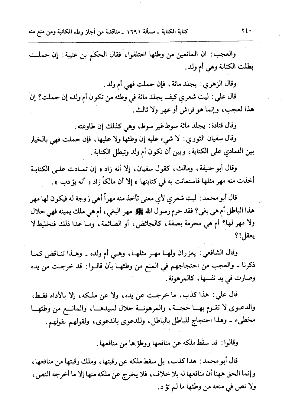 وَقَالُوا: قَدْ سَقَطَ مِلْكُهُ عَنْ مَنَافِعِهَا وَوَطْؤُهَا مِنْ مَنَافِعِهَا. قَالَ أَبُو مُحَمَّدٍ: هَذَا كَذِبٌ، بَلْ سَقَطَ مِلْكُهُ عَنْ رَقَبَتِهَا، وَمِلْكُ رَقَبَتِهَا مِنْ مَنَافِعِهَا، وَإِنَّمَا الْحَقُّ هَاهُنَا أَنَّ مَنَافِعَهَا لَهُ بِلَا خِلَافٍ، فَلَا يَخْرُجُ عَنْ مِلْكِهِ مِنْهُمَا إلَّا مَا أَخْرَجَهُ النَّصُّ، وَلَا نَصَّ فِي مَنْعِهِ مِنْ وَطْئِهَا مَا لَمْ تُؤَدِّ.