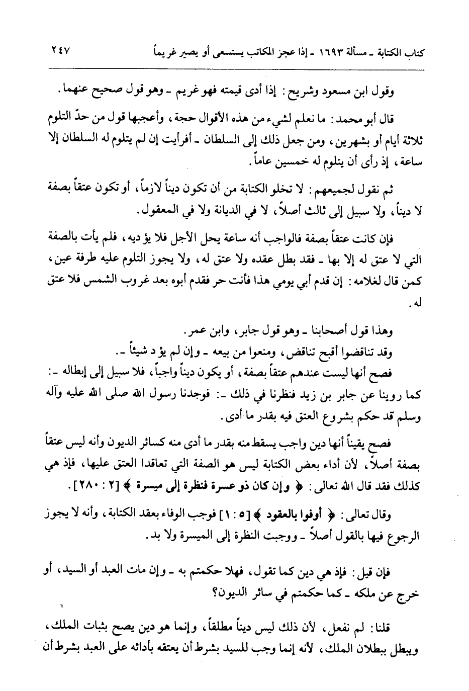 وَقَدْ تَنَاقَضُوا أَقْبَحَ تَنَاقُضٍ، وَمَنَعُوا مِنْ بَيْعِهِ - وَإِنْ لَمْ يُؤَدِّ شَيْئًا -. فَصَحَّ أَنَّهَا لَيْسَتْ عِنْدَهُمْ عِتْقًا بِصِفَةٍ، أَوْ يَكُونَ دَيْنًا وَاجِبًا، فَلَا سَبِيلَ إلَى إبْطَالِهِ. كَمَا رُوِّينَا عَنْ جَابِرِ بْنِ زَيْدٍ فَنَظَرْنَا فِي ذَلِكَ. فَوَجَدْنَا رَسُولَ اللَّهِ - صَلَّى اللَّهُ عَلَيْهِ وَآلِهِ وَسَلَّمَ - قَدْ حَكَمَ بِشُرُوعِ الْعِتْقِ فِيهِ بِقَدْرِ مَا أَدَّى. فَصَحَّ يَقِينًا أَنَّهَا دَيْنٌ وَاجِبٌ يَسْقُطُ مِنْهُ بِقَدْرِ مَا أَدَّى مِنْهُ كَسَائِرِ الدُّيُونِ وَأَنَّهُ لَيْسَ عِتْقًا بِصِفَةٍ أَصْلًا؛ لِأَنَّ أَدَاءَ بَعْضِ الْكِتَابَةِ لَيْسَ هُوَ الصِّفَةَ الَّتِي تَعَاقَدَا الْعِتْقَ عَلَيْهَا، فَإِذْ هِيَ كَذَلِكَ فَقَدْ قَالَ اللَّهُ تَعَالَى: {وَإِنْ كَانَ ذُو عُسْرَةٍ فَنَظِرَةٌ إِلَى مَيْسَرَةٍ} [البقرة: 280] وَقَالَ تَعَالَى: {أَوْفُوا بِالْعُقُودِ} [المائدة: 1] فَوَجَبَ الْوَفَاءُ بِعَقْدِ الْكِتَابَةِ، وَأَنَّهُ لَا يَجُوزُ الرُّجُوعُ فِيهَا بِالْقَوْلِ أَصْلًا - وَوَجَبَتْ النَّظِرَةُ إلَى الْمَيْسَرَةِ وَلَا بُدَّ.