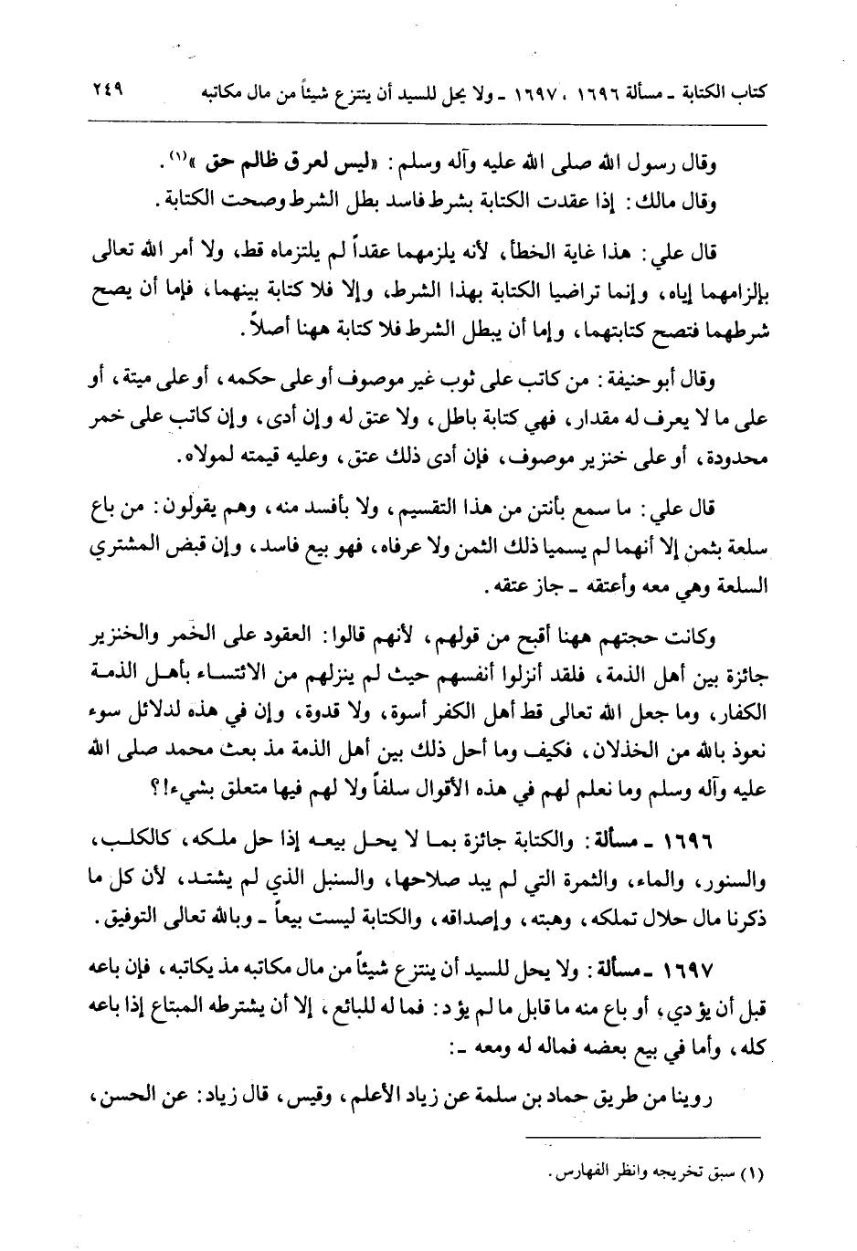 1697 - مَسْأَلَةٌ: وَلَا يَحِلُّ لِلسَّيِّدِ أَنْ يَنْتَزِعَ شَيْئًا مِنْ مَالِ مُكَاتَبِهِ مُذْ يُكَاتِبُهُ، فَإِنْ بَاعَهُ قَبْلَ أَنْ يُؤَدِّيَ؛ أَوْ بَاعَ مِنْهُ مَا قَابَلَ مَا لَمْ يُؤَدِّ: فَمَالُهُ لِلْبَائِعِ، إلَّا أَنْ يَشْتَرِطَهُ الْمُبْتَاعُ إذَا بَاعَهُ كُلَّهُ، وَأَمَّا فِي بَيْعِ بَعْضِهِ فَمَالُهُ لَهُ وَمَعَهُ. رُوِّينَا مِنْ طَرِيقِ حَمَّادِ بْنِ سَلَمَةَ عَنْ زِيَادٍ الْأَعْلَمِ، وَقَيْسٍ، قَالَ زِيَادٌ: عَنْ الْحَسَنِ،