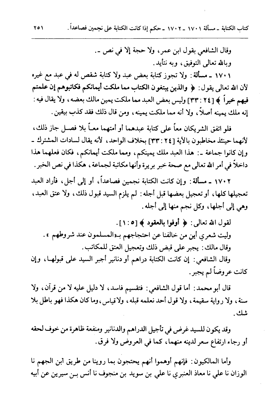 1701 - مَسْأَلَةٌ: وَلَا تَجُوزُ كِتَابَةُ بَعْضِ عَبْدٍ وَلَا كِتَابَةُ شِقْصٍ لَهُ فِي عَبْدٍ مَعَ غَيْرِهِ لِأَنَّ اللَّهَ تَعَالَى يَقُولُ {وَالَّذِينَ يَبْتَغُونَ الْكِتَابَ مِمَّا مَلَكَتْ أَيْمَانُكُمْ فَكَاتِبُوهُمْ إِنْ عَلِمْتُمْ فِيهِمْ خَيْرًا} [النور: 33] وَلَيْسَ بَعْضُ الْعَبْدِ مِمَّا مَلَكَتْ يَمِينُ مَالِك بَعْضِهِ، وَلَا يُقَالُ فِيهِ: إنَّهُ مِلْكُ يَمِينِهِ أَصْلًا، وَلَا أَنَّهُ مِمَّا مَلَكَتْ يَمِينُهُ، وَمَنْ قَالَ ذَلِكَ فَقَدْ كَذَبَ بِيَقِينٍ. فَلَوْ اتَّفَقَ الشَّرِيكَانِ مَعًا عَلَى كِتَابَةِ عَبْدِهِمَا أَوْ أَمَتِهِمَا مَعًا بِلَا فَصْلٍ جَازَ ذَلِكَ، لِأَنَّهُمَا حِينَئِذٍ مُخَاطَبُونَ بِالْآيَةِ بِخِلَافِ الْوَاحِدِ؛ لِأَنَّهُ يُقَالُ لِسَادَاتِ الْمُشْتَرَكِ - وَإِنْ كَانُوا جَمَاعَةً: هَذَا الْعَبْدُ مِلْكُ يَمِينِكُمْ، وَمِمَّا مَلَكَتْ أَيْمَانُكُمْ، فَكَانَ فِعْلُهُمَا هَذَا دَاخِلًا فِي أَمْرِ اللَّهِ تَعَالَى مَعَ صِحَّةِ خَبَرِ بَرِيرَةَ وَأَنَّهَا مُكَاتَبَةٌ لِجَمَاعَةٍ، هَكَذَا فِي نَصِّ الْخَبَرِ.