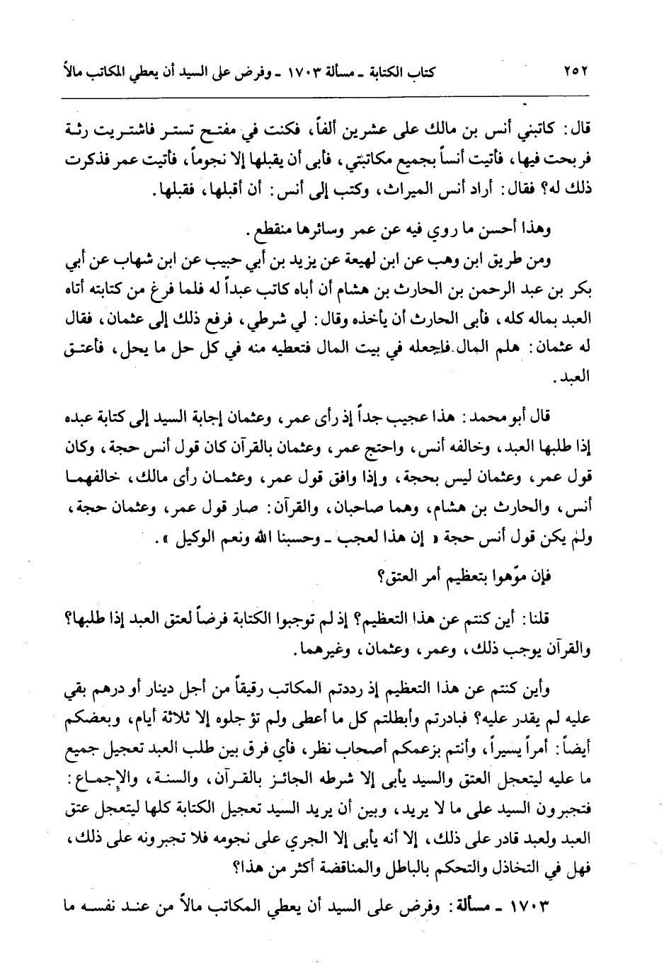 قَالَ: كَاتَبَنِي أَنَسُ بْنُ مَالِكٍ عَلَى عِشْرِينَ أَلْفًا، فَكُنْت فِي مِفْتَحِ تُسْتَرَ فَاشْتَرَيْت رَثَّةً فَرَبِحْت فِيهَا، فَأَتَيْت أَنَسًا بِجَمِيعِ مُكَاتَبَتِي، فَأَبَى أَنْ يَقْبَلَهَا إلَّا نُجُومًا، فَأَتَيْت عُمَرَ فَذَكَرْت ذَلِكَ لَهُ؟ فَقَالَ: أَرَادَ أَنَسٌ الْمِيرَاثَ، وَكَتَبَ إلَى أَنَسٍ: أَنْ اقْبَلْهَا، فَقَبِلَهَا. وَهَذَا أَحْسَنُ مَا رُوِيَ فِيهِ عَنْ عُمَرَ وَسَائِرُهَا مُنْقَطِعٌ. وَمِنْ طَرِيقِ ابْنِ وَهْبٍ عَنْ ابْنِ لَهِيعَةَ عَنْ يَزِيدَ بْنِ أَبِي حَبِيبٍ عَنْ ابْنِ شِهَابٍ عَنْ أَبِي بَكْرِ بْنِ عَبْدِ الرَّحْمَنِ بْنِ الْحَارِثِ بْنِ هِشَامٍ أَنَّ أَبَاهُ كَاتَبَ عَبْدًا لَهُ فَلَمَّا فَرَغَ مِنْ كِتَابَتِهِ أَتَاهُ الْعَبْدُ بِمَالِهِ كُلِّهِ، فَأَبَى الْحَارِثُ أَنْ يَأْخُذَهُ وَقَالَ: لِي شَرْطِي، فَرَفَعَ ذَلِكَ إلَى عُثْمَانَ، فَقَالَ لَهُ عُثْمَانُ: هَلُمَّ الْمَالَ فَاجْعَلْهُ فِي بَيْتِ الْمَالِ فَتُعْطِيه مِنْهُ فِي كُلِّ حِلٍّ مَا يَحِلُّ، فَأَعْتَقَ الْعَبْدَ. قَالَ أَبُو مُحَمَّدٍ: هَذَا عَجِيبٌ جِدًّا إذْ رَأَى عُمَرُ، وَعُثْمَانُ إجَابَةَ السَّيِّدِ إلَى كِتَابَةِ عَبْدِهِ إذَا طَلَبَهَا الْعَبْدُ، وَخَالَفَهُ أَنَسٌ، وَاحْتَجَّ عُمَرُ، وَعُثْمَانُ بِالْقُرْآنِ كَانَ قَوْلُ أَنَسٍ حُجَّةً، وَكَانَ قَوْلُ عُمَرَ، وَعُثْمَانَ لَيْسَ بِحُجَّةٍ، وَإِذَا وَافَقَ قَوْلُ عُمَرَ، وَعُثْمَانَ رَأْيَ مَالِكٍ، خَالَفَهُمَا أَنَسٌ، وَالْحَارِثُ بْنُ هِشَامٍ، وَهُمَا صَاحِبَانِ، وَالْقُرْآنُ: صَارَ قَوْلُ عُمَرَ، وَعُثْمَانَ حُجَّةً، وَلَمْ يَكُنْ قَوْلُ أَنَسٍ حُجَّةً " إنَّ هَذَا لَعَجَبٌ - وَحَسْبُنَا اللَّهُ وَنِعْمَ الْوَكِيلُ ".