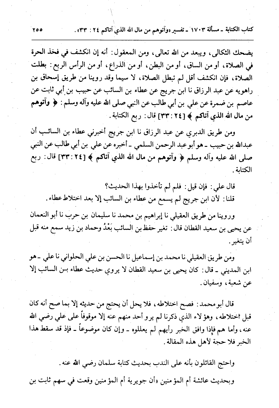 وَمِنْ طَرِيقِ الدَّبَرِيِّ عَنْ عَبْدِ الرَّزَّاقِ نا ابْنُ جُرَيْجٍ أَخْبَرَنِي عَطَاءُ بْنُ السَّائِبِ أَنَّ عَبْدَ اللَّهِ بْنَ حَبِيبٍ - هُوَ أَبُو عَبْدِ الرَّحْمَنِ السُّلَمِيُّ - أَخْبَرَهُ عَنْ عَلِيِّ بْنِ أَبِي طَالِبٍ «عَنْ النَّبِيِّ - صَلَّى اللَّهُ عَلَيْهِ وَآلِهِ وَسَلَّمَ - {وَآتُوهُمْ مِنْ مَالِ اللَّهِ الَّذِي آتَاكُمْ} [النور: 33] قَالَ: رُبُعُ الْكِتَابَةِ» ، قَالَ عَلِيٌّ: فَإِنْ قِيلَ: فَلَمْ لَمْ تَأْخُذُوا بِهَذَا الْحَدِيثِ؟ قُلْنَا: لِأَنَّ ابْنَ جُرَيْجٍ لَمْ يَسْمَعْ مِنْ عَطَاءِ بْنِ السَّائِبِ إلَّا بَعْدَ اخْتِلَاطِ عَطَاءٍ.