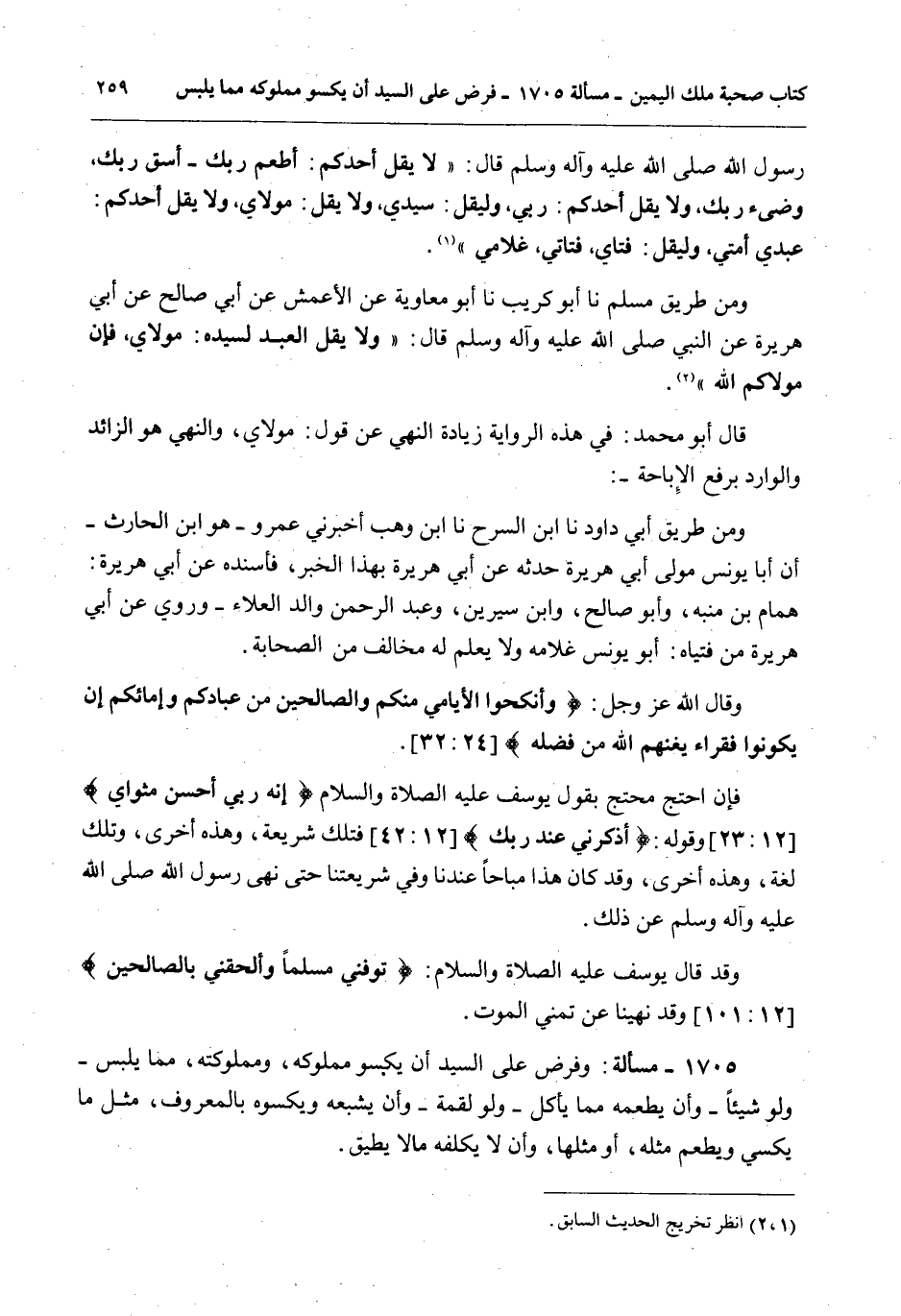 1705 - مَسْأَلَةٌ: وَفَرْضٌ عَلَى السَّيِّدِ أَنْ يَكْسُوَ مَمْلُوكَهُ، وَمَمْلُوكَتَهُ، مِمَّا يَلْبَسُ - وَلَوْ شَيْئًا - وَأَنْ يُطْعِمَهُ مِمَّا يَأْكُلُ وَلَوْ لُقْمَةً - وَأَنْ يُشْبِعَهُ وَيَكْسُوَهُ بِالْمَعْرُوفِ، مِثْلَ مَا يُكْسَى وَيُطْعَمُ مِثْلُهُ، أَوْ مِثْلُهَا، وَأَنْ لَا يُكَلِّفَهُ مَا لَا يُطِيقُ.