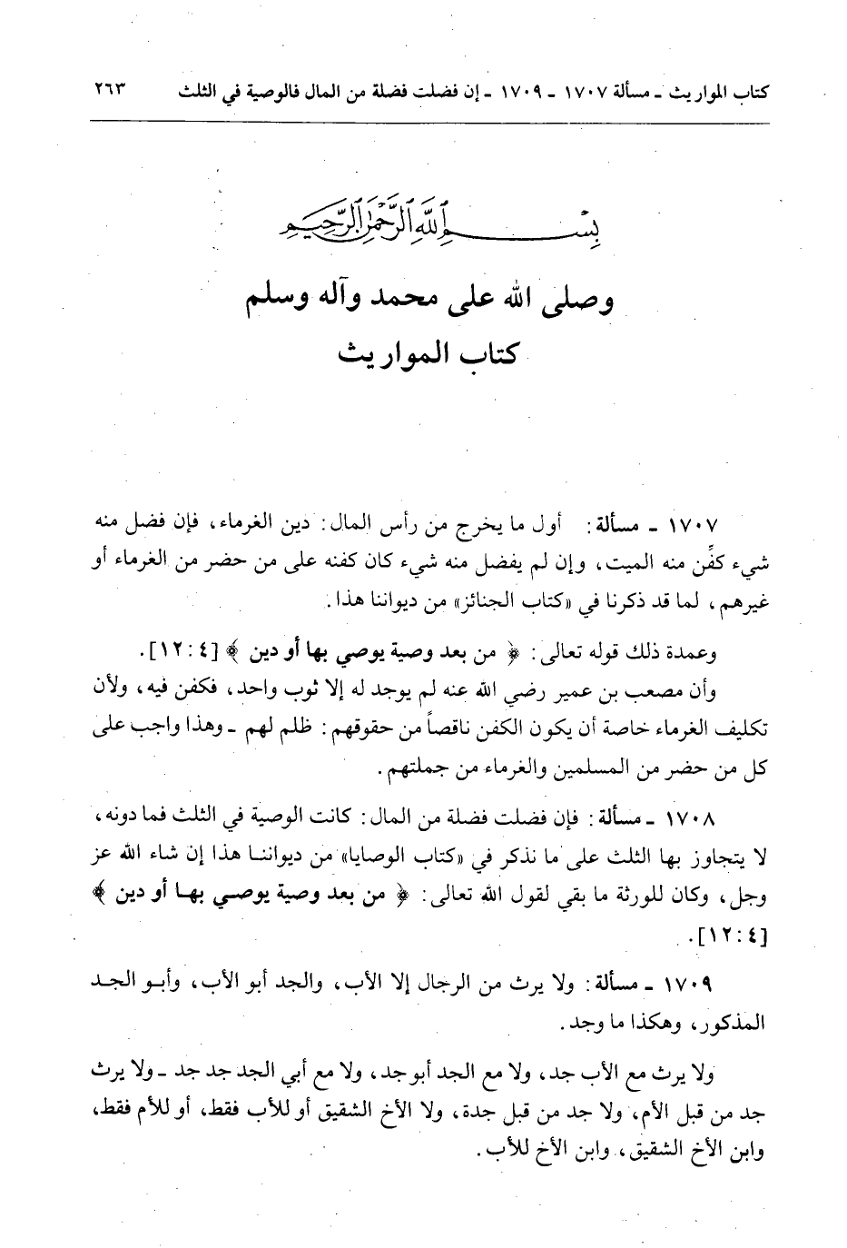 1708 - مَسْأَلَةٌ: فَإِنْ فَضَلَتْ فَضْلَةٌ مِنْ الْمَالِ: كَانَتْ الْوَصِيَّةُ فِي الثُّلُثِ فَمَا دُونَهُ، لَا يَتَجَاوَزُ بِهَا الثُّلُثَ عَلَى مَا نَذْكُرُ فِي " كِتَابِ الْوَصَايَا " مِنْ دِيوَانِنَا هَذَا إنْ شَاءَ اللَّهُ عَزَّ وَجَلَّ، وَكَانَ لِلْوَرَثَةِ مَا بَقِيَ لِقَوْلِ اللَّهِ تَعَالَى: {مِنْ بَعْدِ وَصِيَّةٍ يُوصِي بِهَا أَوْ دَيْنٍ} [النساء: 11]