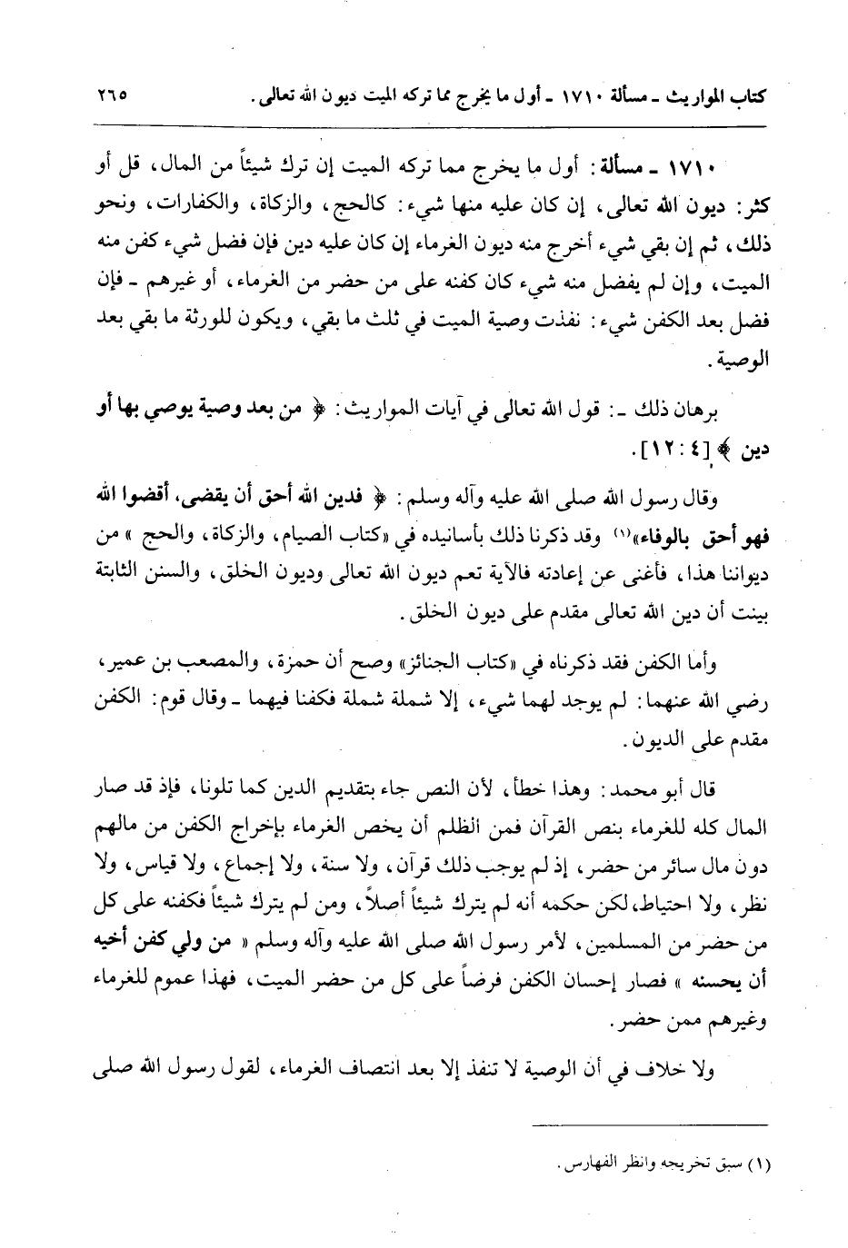 بُرْهَانُ ذَلِكَ قَوْلُ اللَّهِ تَعَالَى فِي آيَاتِ الْمَوَارِيثِ: {مِنْ بَعْدِ وَصِيَّةٍ يُوصِي بِهَا أَوْ دَيْنٍ} [النساء: 11] ، وَقَالَ رَسُولُ اللَّهِ - صَلَّى اللَّهُ عَلَيْهِ وَآلِهِ وَسَلَّمَ -: «فَدَيْنُ اللَّهِ أَحَقُّ أَنْ يُقْضَى، اقْضُوا اللَّهَ فَهُوَ أَحَقُّ بِالْوَفَاءِ» ) وَقَدْ ذَكَرْنَا ذَلِكَ بِأَسَانِيدِهِ فِي " كِتَابِ الصِّيَامِ، وَالزَّكَاةِ، وَالْحَجِّ " مِنْ دِيوَانِنَا هَذَا، فَأَغْنَى عَنْ إعَادَتِهِ فَالْآيَةُ تَعُمُّ دُيُونَ اللَّهِ تَعَالَى وَدُيُونَ الْخَلْقِ، وَالسُّنَنُ الثَّابِتَةُ بَيَّنَتْ أَنَّ دَيْنَ اللَّهِ تَعَالَى مُقَدَّمٌ عَلَى دُيُونِ الْخَلْقِ.