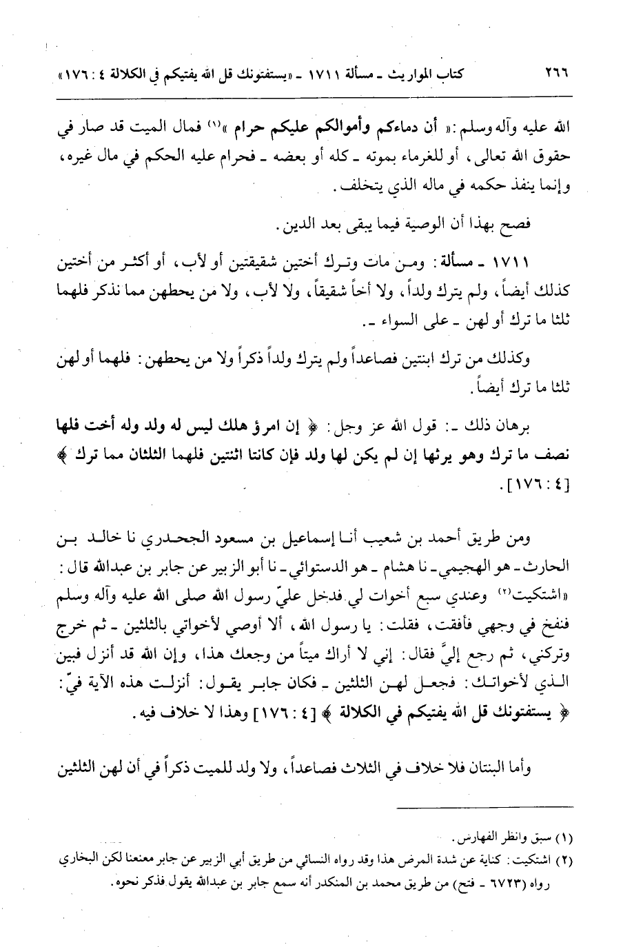 وَمِنْ طَرِيقِ أَحْمَدَ بْنِ شُعَيْبٍ نا إسْمَاعِيلُ بْنُ مَسْعُودٍ الْجَحْدَرِيُّ نا خَالِدُ بْنُ الْحَارِثِ - هُوَ الْهُجَيْمِيُّ - نا هِشَامٌ - هُوَ الدَّسْتُوَائِيُّ - نا أَبُو الزُّبَيْرِ عَنْ جَابِرِ بْنِ عَبْدِ اللَّهِ قَالَ: «اشْتَكَيْت وَعِنْدِي سَبْعُ أَخَوَاتٍ لِي فَدَخَلَ عَلَيَّ رَسُولُ اللَّهِ - صَلَّى اللَّهُ عَلَيْهِ وَآلِهِ وَسَلَّمَ - فَنَفَخَ فِي وَجْهِي فَأَفَقْتُ، فَقُلْتُ: يَا رَسُولَ اللَّهِ، أَلَا أُوصِي لِأَخَوَاتِي بِالثُّلُثَيْنِ - ثُمَّ خَرَجَ وَتَرَكَنِي، ثُمَّ رَجَعَ إلَيَّ فَقَالَ: إنِّي لَا أَرَاك مَيِّتًا مِنْ وَجَعِكَ هَذَا، وَإِنَّ اللَّهَ قَدْ أَنْزَلَ فَبَيَّنَ الَّذِي لِأَخَوَاتِكَ: فَجَعَلَ لَهُنَّ الثُّلُثَيْنِ - فَكَانَ جَابِرٌ يَقُولُ: أُنْزِلَتْ هَذِهِ الْآيَةُ فِي: {يَسْتَفْتُونَكَ قُلِ اللَّهُ يُفْتِيكُمْ فِي الْكَلالَةِ} [النساء: 176] » وَهَذَا لَا خِلَافَ فِيهِ.