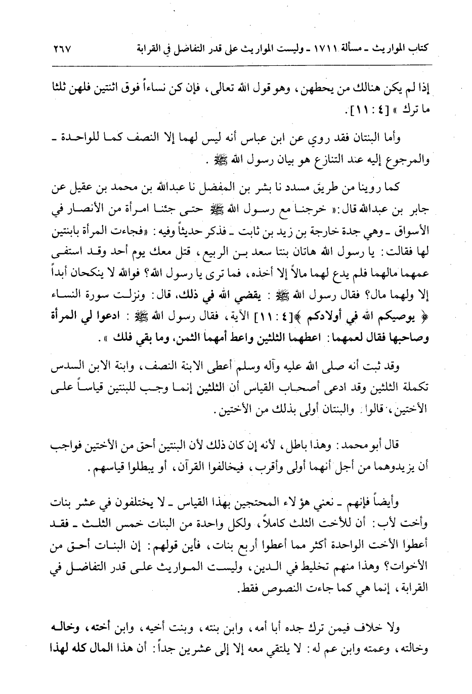 وَأَيْضًا فَإِنَّهُمْ - نَعْنِي هَؤُلَاءِ الْمُحْتَجِّينَ بِهَذَا الْقِيَاسِ - لَا يَخْتَلِفُونَ فِي عَشْرِ بَنَاتٍ وَأُخْتٍ لِأَبٍ: أَنَّ لِلْأُخْتِ الثُّلُثَ كَامِلًا، وَلِكُلِّ وَاحِدَةٍ مِنْ الْبَنَاتِ خُمُسُ الثُّلُثِ - فَقَدْ أَعْطُوا الْأُخْتَ الْوَاحِدَةَ أَكْثَرَ مِمَّا أَعْطُوا أَرْبَعَ بَنَاتٍ، فَأَيْنَ قَوْلُهُمْ: إنَّ الْبَنَاتِ أَحَقُّ مِنْ الْأَخَوَاتِ؟ وَهَذَا مِنْهُمْ تَخْلِيطٌ فِي الدِّينِ، وَلَيْسَتْ الْمَوَارِيثُ عَلَى قَدْرِ التَّفَاضُلِ فِي الْقَرَابَةِ، إنَّمَا هِيَ كَمَا جَاءَتْ النُّصُوصُ فَقَطْ.