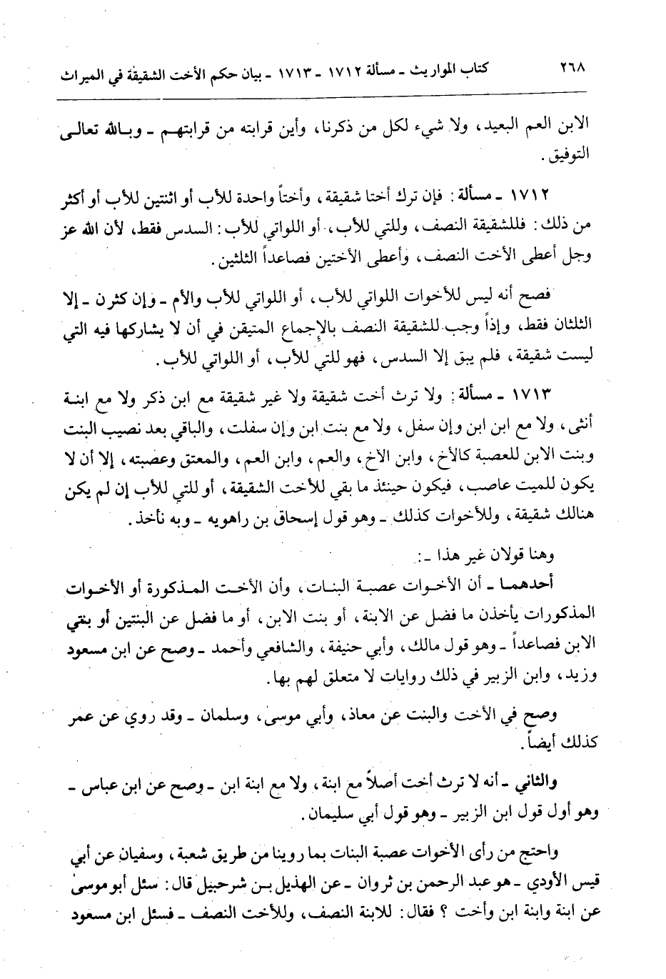 1713 - مَسْأَلَةٌ: وَلَا تَرِثُ أُخْتٌ شَقِيقَةٌ وَلَا غَيْرُ شَقِيقَةٍ مَعَ ابْنٍ ذَكَرٍ وَلَا مَعَ ابْنَةٍ أُنْثَى، وَلَا مَعَ ابْنِ ابْنٍ وَإِنْ سَفَلَ، وَلَا مَعَ بِنْتِ ابْنٍ وَإِنْ سَفَلَتْ، وَالْبَاقِي بَعْدَ نَصِيبِ الْبِنْتِ وَبِنْتِ الِابْنِ لِلْعَصَبَةِ كَالْأَخِ، وَابْنِ الْأَخِ، وَالْعَمِّ، وَابْنِ الْعَمِّ، وَالْمُعْتَقِ وَعَصَبَتِهِ، إلَّا أَنْ لَا يَكُونَ لِلْمَيِّتِ عَاصِبٌ، فَيَكُونُ حِينَئِذٍ مَا بَقِيَ لِلْأُخْتِ الشَّقِيقَةِ، أَوْ لِلَّتِي لِلْأَبِ إنْ لَمْ يَكُنْ هُنَالِكَ شَقِيقَةً، وَلِلْأَخَوَاتِ كَذَلِكَ - وَهُوَ قَوْلُ إِسْحَاقَ بْنِ رَاهْوَيْهِ - وَبِهِ نَأْخُذُ.