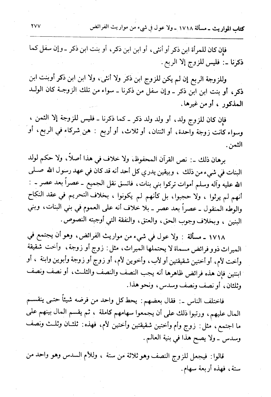 1718 - مَسْأَلَةٌ: وَلَا عَوْلَ فِي شَيْءٍ مِنْ مَوَارِيثِ الْفَرَائِضِ وَهُوَ أَنْ يَجْتَمِعَ فِي الْمِيرَاثِ ذَوُو فَرَائِضَ مُسَمَّاةٍ لَا يَحْتَمِلُهَا الْمِيرَاثُ، مِثْلُ: زَوْجٍ أَوْ زَوْجَةٍ، وَأُخْتٍ شَقِيقَةٍ وَأُخْتٍ لِأُمٍّ، أَوْ أُخْتَيْنِ شَقِيقَتَيْنِ أَوْ لِأَبٍ، وَأَخَوَيْنِ لِأُمٍّ، أَوْ زَوْجٍ أَوْ زَوْجَةٍ وَأَبَوَيْنِ وَابْنَةٍ، أَوْ ابْنَتَيْنِ فَإِنَّ هَذِهِ فَرَائِضَ ظَاهِرُهَا أَنَّهُ يَجِبُ النِّصْفُ وَالنِّصْفُ وَالثُّلُثُ، أَوْ نِصْفٌ وَنِصْفٌ وَثُلُثَانِ، أَوْ نِصْفٌ وَنِصْفٌ وَسُدُسٌ، وَنَحْوُ هَذَا.