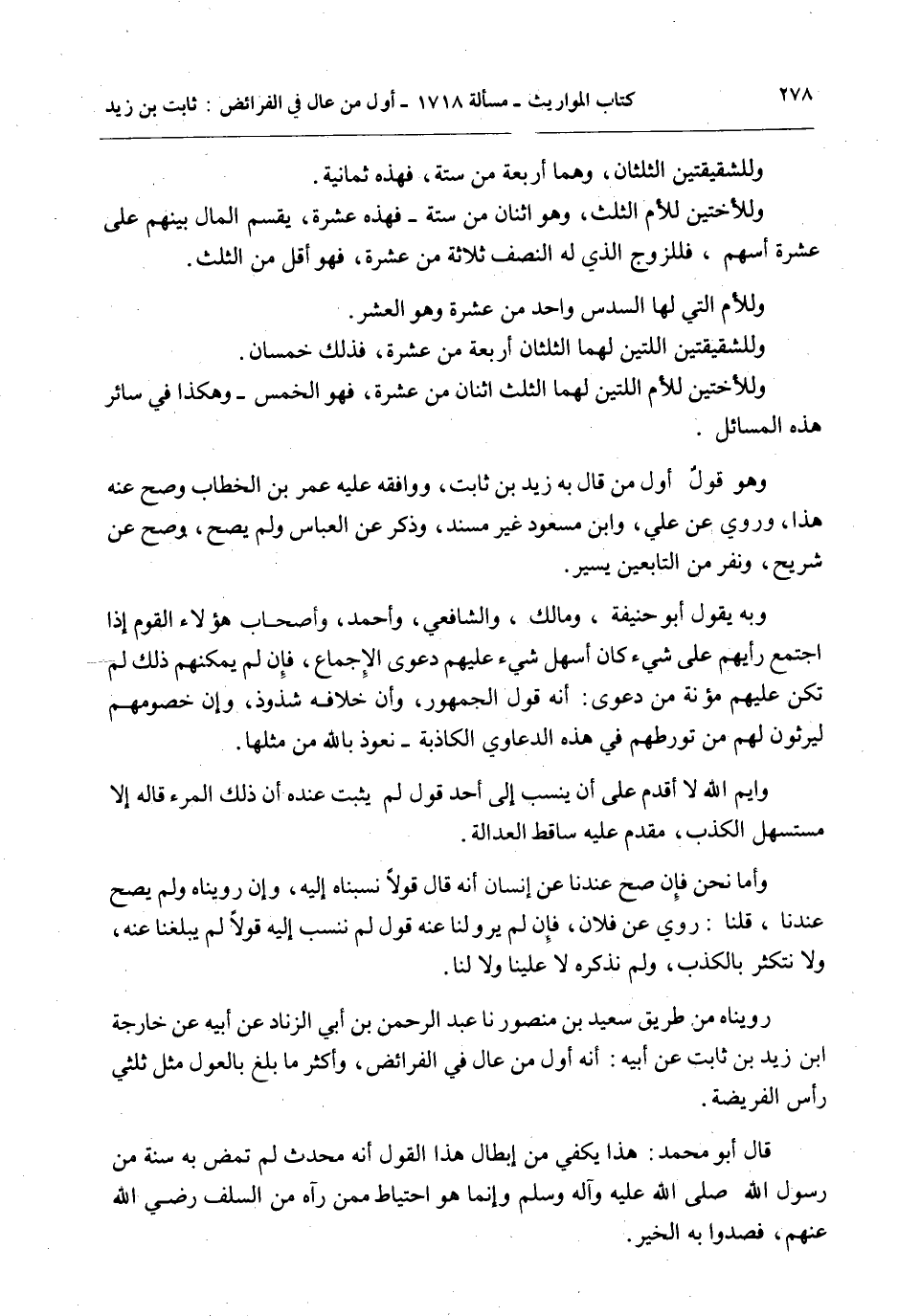 رُوِّينَاهُ مِنْ طَرِيقِ سَعِيدِ بْنِ مَنْصُورٍ نا عَبْدُ الرَّحْمَنِ بْنُ أَبِي الزِّنَادِ عَنْ أَبِيهِ عَنْ خَارِجَةَ بْنِ زَيْدِ بْنِ ثَابِتٍ عَنْ أَبِيهِ: أَنَّهُ أَوَّلُ مَنْ عَالَ فِي الْفَرَائِضِ، وَأَكْثَرُ مَا بَلَغَ بِالْعَوْلِ مِثْلُ ثُلُثَيْ رَأْسِ الْفَرِيضَةِ.
