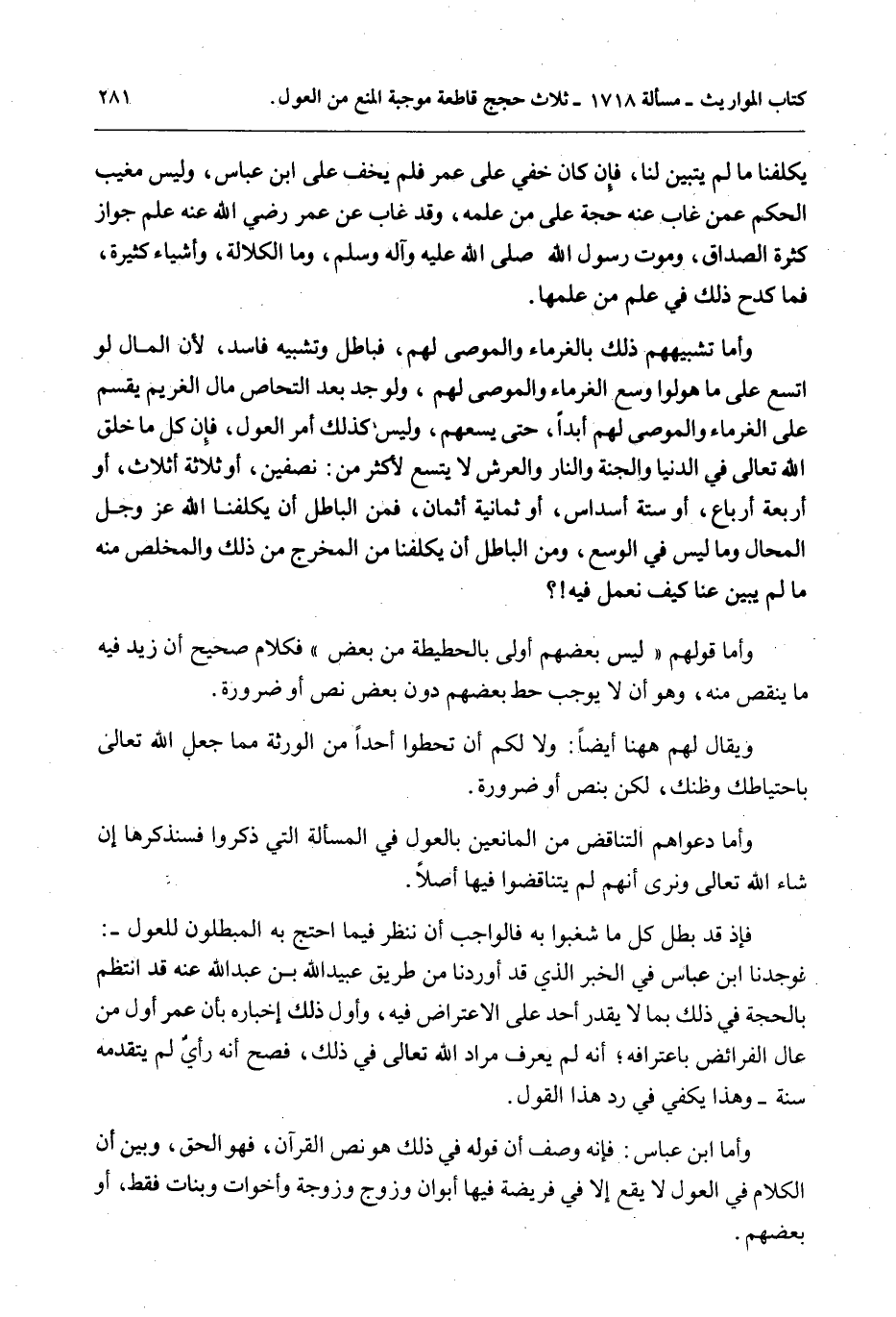 فَإِذْ قَدْ بَطَلَ كُلُّ مَا شَغَبُوا بِهِ فَالْوَاجِبُ أَنْ نَنْظُرَ فِيمَا احْتَجَّ بِهِ الْمُبْطِلُونَ لِلْعَوْلِ. فَوَجَدْنَا ابْنَ عَبَّاسٍ فِي الْخَبَرِ الَّذِي قَدْ أَوْرَدْنَا مِنْ طَرِيقِ عُبَيْدِ اللَّهِ بْنِ عَبْدِ اللَّهِ عَنْهُ قَدْ انْتَظَمَ بِالْحُجَّةِ فِي ذَلِكَ بِمَا لَا يَقْدِرُ أَحَدٌ عَلَى الِاعْتِرَاضِ فِيهِ، وَأَوَّلُ ذَلِكَ إخْبَارُهُ بِأَنَّ عُمَرَ أَوَّلُ مَنْ عَالَ الْفَرَائِضَ بِاعْتِرَافِهِ؛ أَنَّهُ لَمْ يَعْرِفْ مُرَادَ اللَّهِ تَعَالَى فِي ذَلِكَ، فَصَحَّ أَنَّهُ رَأْيٌ لَمْ يَتَقَدَّمْهُ سُنَّةٌ - وَهَذَا يَكْفِي فِي رَدِّ هَذَا الْقَوْلِ.