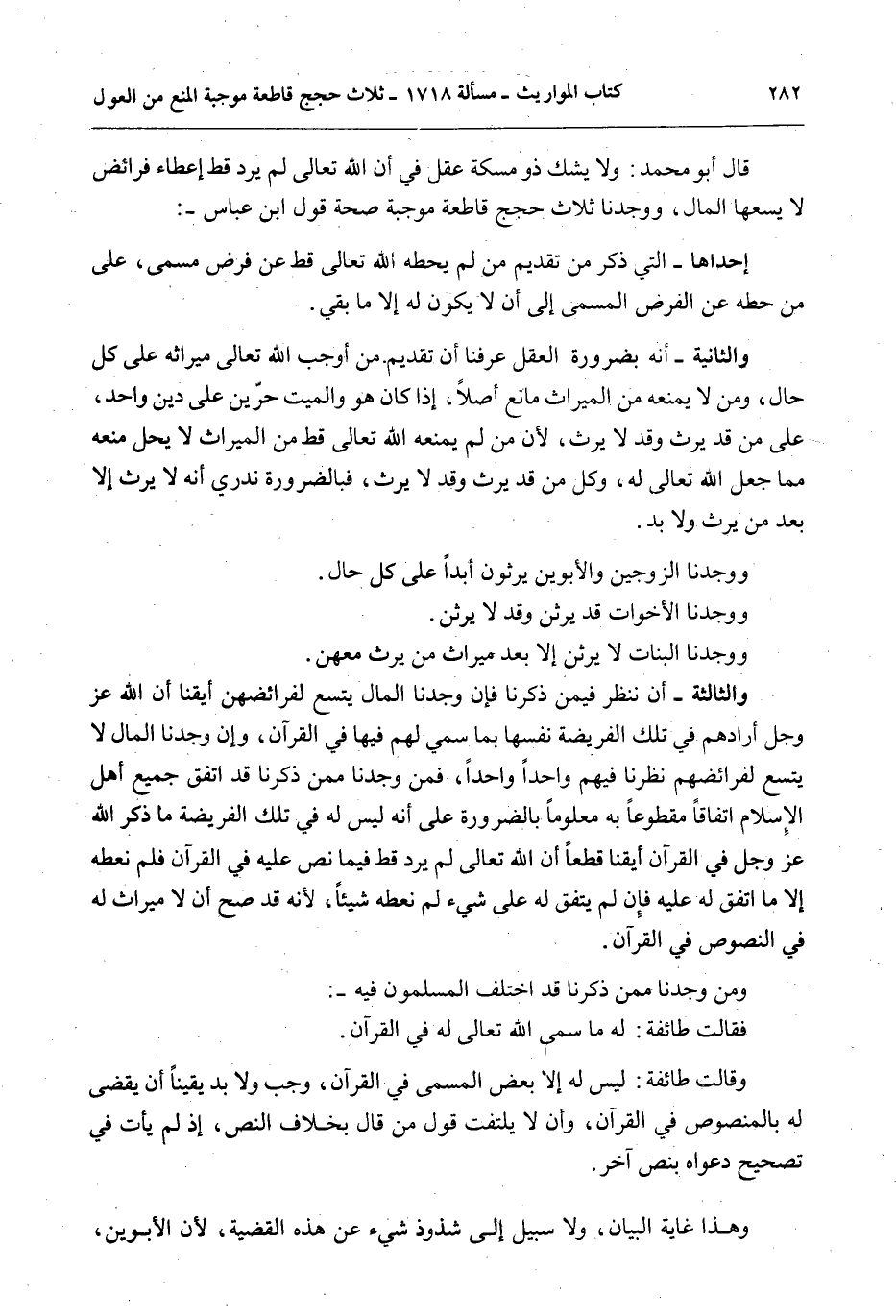 قَالَ أَبُو مُحَمَّدٍ: وَلَا يَشُكُّ ذُو مُسْكَةِ عَقْلٍ فِي أَنَّ اللَّهَ تَعَالَى لَمْ يُرِدْ قَطُّ إعْطَاءَ فَرَائِضَ لَا يَسَعُهَا الْمَالُ، وَوَجَدْنَا ثَلَاثَ حُجَجٍ قَاطِعَةٍ مُوجِبَةٍ صِحَّةَ قَوْلِ ابْنِ عَبَّاسٍ. إحْدَاهَا - الَّتِي ذَكَرَ مِنْ تَقْدِيمِ مَنْ لَمْ يَحُطَّهُ اللَّهُ تَعَالَى قَطُّ عَنْ فَرْضٍ مُسَمًّى، عَلَى مَنْ حَطَّهُ عَنْ الْفَرْضِ الْمُسَمَّى إلَى أَنْ لَا يَكُونَ لَهُ إلَّا مَا بَقِيَ.