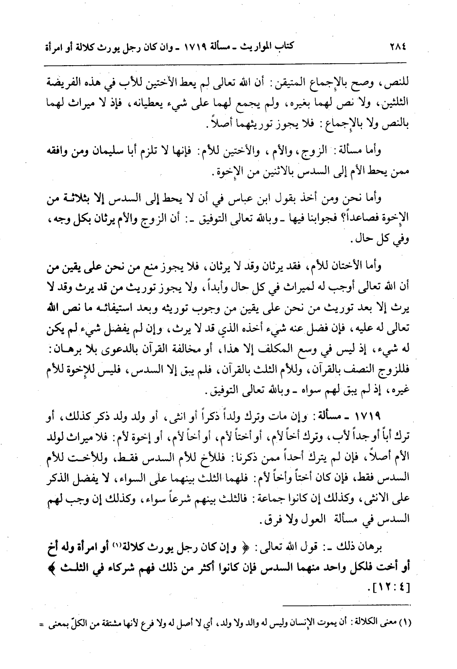 بُرْهَانُ ذَلِكَ قَوْلُ اللَّهِ تَعَالَى: {وَإِنْ كَانَ رَجُلٌ يُورَثُ كَلالَةً أَوِ امْرَأَةٌ وَلَهُ أَخٌ أَوْ أُخْتٌ فَلِكُلِّ وَاحِدٍ مِنْهُمَا السُّدُسُ فَإِنْ كَانُوا أَكْثَرَ مِنْ ذَلِكَ فَهُمْ شُرَكَاءُ فِي الثُّلُثِ} [النساء: 12] .
