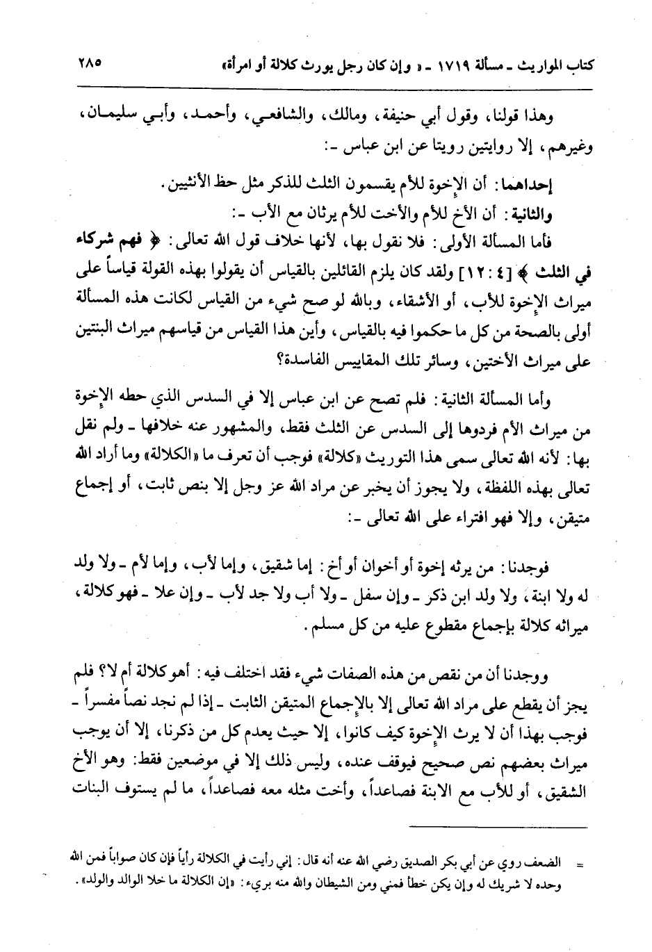 وَأَمَّا الْمَسْأَلَةُ الثَّانِيَةُ: فَلَمْ تَصِحَّ عَنْ ابْنِ عَبَّاسٍ إلَّا فِي السُّدُسِ الَّذِي حَطَّهُ الْإِخْوَةُ مِنْ مِيرَاثِ الْأُمِّ فَرَدُّوهَا إلَى السُّدُسِ عَنْ الثُّلُثِ فَقَطْ، وَالْمَشْهُورُ عَنْهُ خِلَافُهَا - وَلَمْ نَقُلْ بِهَا: لِأَنَّ اللَّهَ تَعَالَى سَمَّى هَذَا التَّوْرِيثَ " كَلَالَةً " فَوَجَبَ أَنْ تَعْرِفَ مَا " الْكَلَالَةُ " وَمَا أَرَادَ اللَّهُ تَعَالَى بِهَذِهِ اللَّفْظَةِ، وَلَا يَجُوزُ أَنْ يُخْبَرَ عَنْ مُرَادِ اللَّهِ عَزَّ وَجَلَّ إلَّا بِنَصٍّ ثَابِتٍ، أَوْ إجْمَاعٍ مُتَيَقَّنٍ، وَإِلَّا فَهُوَ افْتِرَاءٌ عَلَى اللَّهِ تَعَالَى. فَوَجَدْنَا: مَنْ يَرِثُهُ إخْوَةٌ أَوْ أَخَوَانِ أَوْ أَخٌ: إمَّا شَقِيقٌ، وَإِمَّا لِأَبٍ، وَإِمَّا لِأُمٍّ - وَلَا وَلَدَ لَهُ وَلَا ابْنَةَ، وَلَا وَلَدَ ابْنِ ذَكَرٍ - وَإِنْ سَفَلَ - وَلَا أَبَ وَلَا جَدَّ لِأَبٍ - وَإِنْ عَلَا - فَهُوَ كَلَالَةٌ، مِيرَاثُهُ كَلَالَةٌ بِإِجْمَاعٍ مَقْطُوعٍ عَلَيْهِ مِنْ كُلِّ مُسْلِمٍ.