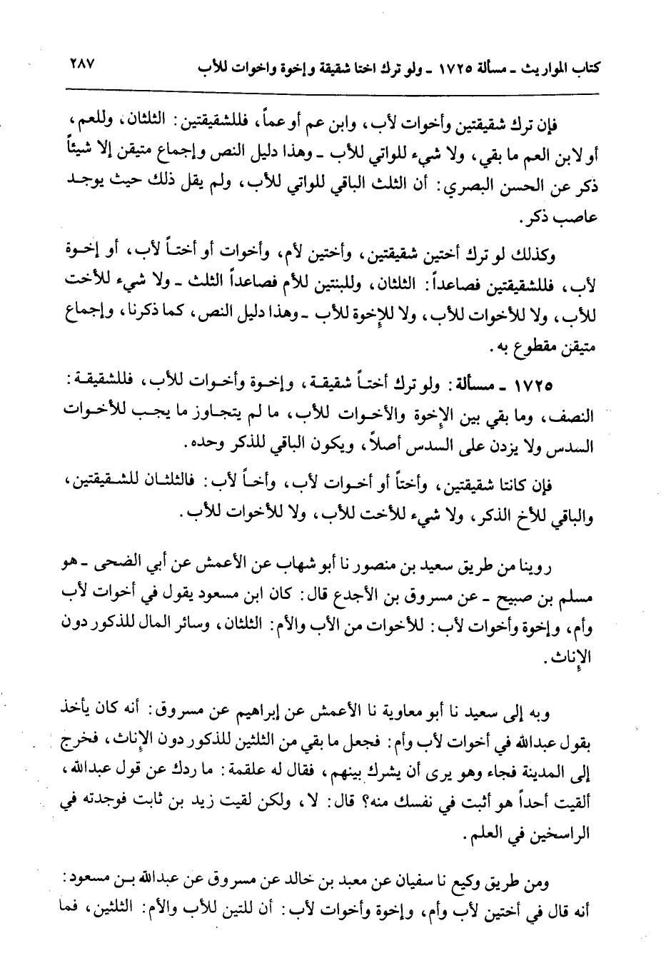 رُوِّينَا مِنْ طَرِيقِ سَعِيدِ بْنِ مَنْصُورٍ نا أَبُو شِهَابٍ عَنْ الْأَعْمَشِ عَنْ أَبِي الضُّحَى - هُوَ مُسْلِمُ بْنُ صُبَيْحٍ - عَنْ مَسْرُوقِ بْنِ الْأَجْدَعِ قَالَ: كَانَ ابْنُ مَسْعُودٍ يَقُولُ فِي أَخَوَاتٍ لِأَبٍ وَأُمٍّ، وَإِخْوَةٍ وَأَخَوَاتٍ لِأَبٍ: لِلْأَخَوَاتِ مِنْ الْأَبِ وَالْأُمِّ: الثُّلُثَانِ، وَسَائِرُ الْمَالِ لِلذُّكُورِ دُونَ الْإِنَاثِ.