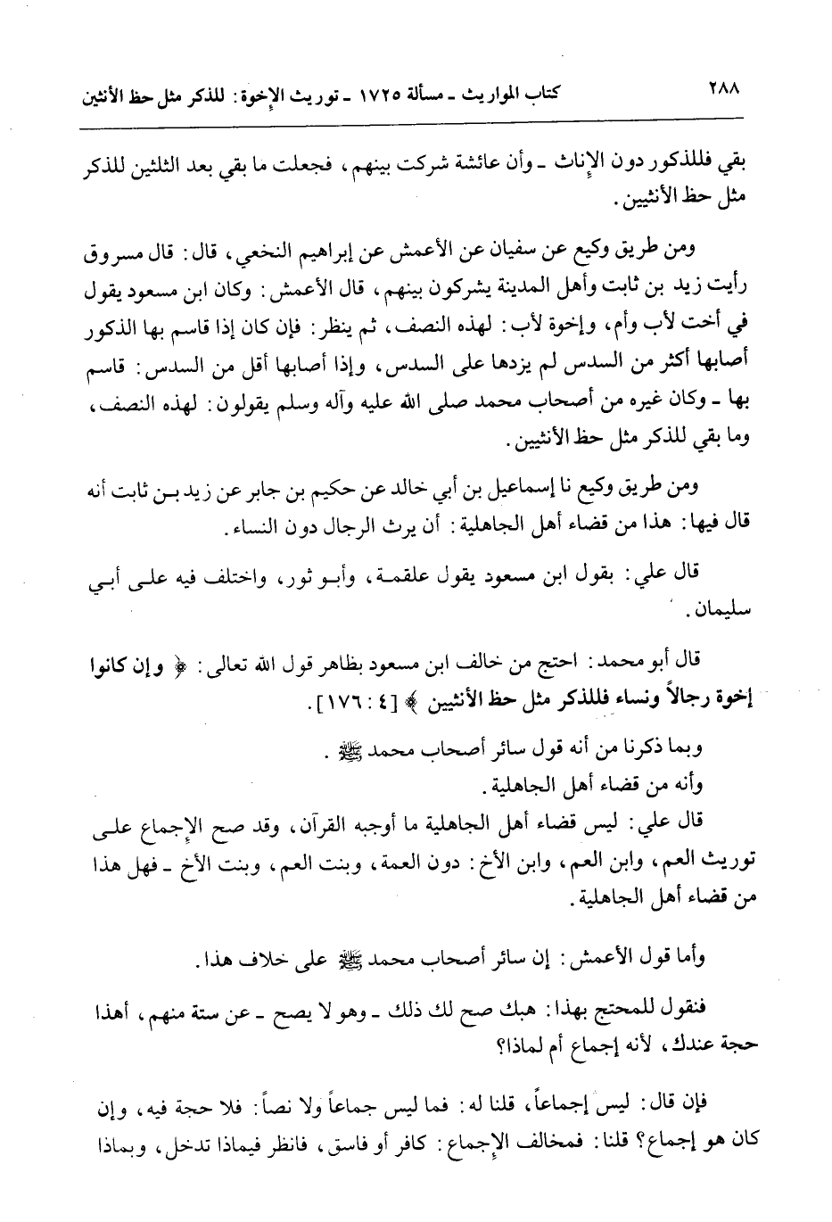 قَالَ أَبُو مُحَمَّدٍ: احْتَجَّ مَنْ خَالَفَ ابْنَ مَسْعُودٍ بِظَاهِرِ قَوْلِ اللَّهِ تَعَالَى: {وَإِنْ كَانُوا إِخْوَةً رِجَالا وَنِسَاءً فَلِلذَّكَرِ مِثْلُ حَظِّ الأُنْثَيَيْنِ} [النساء: 176]