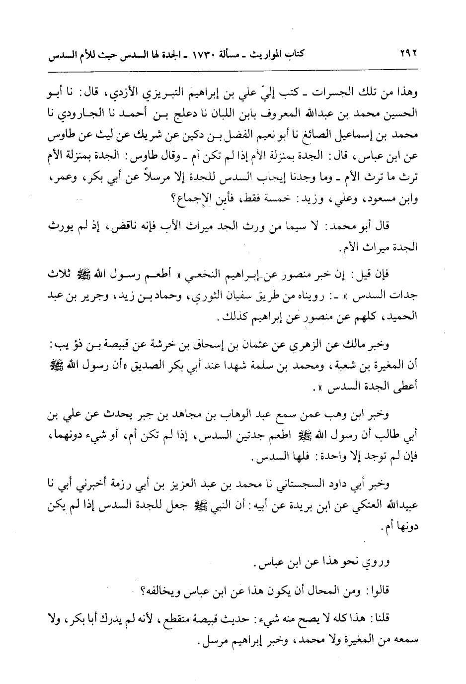 وَهَذَا مِنْ تِلْكَ الْجَسْرَاتِ - كَتَبَ إلَيَّ عَلِيُّ بْنُ إبْرَاهِيمَ التَّبْرِيزِيُّ الْأَزْدِيُّ، قَالَ: نا أَبُو الْحُسَيْنِ مُحَمَّدُ بْنُ عَبْدِ اللَّهِ الْمَعْرُوفُ بِابْنِ اللَّبَّانِ نا دِعْلِجُ بْنُ أَحْمَدَ نا الْجَارُودِيُّ نا مُحَمَّدُ بْنُ إسْمَاعِيلَ الصَّائِغُ نا أَبُو نُعَيْمٍ الْفَضْلُ بْنُ دُكَيْنٍ عَنْ شَرِيكٍ عَنْ لَيْثٍ عَنْ طَاوُسٍ عَنْ ابْنِ عَبَّاسٍ، قَالَ: الْجَدَّةُ بِمَنْزِلَةِ الْأُمِّ إذَا لَمْ تَكُنْ أُمٌّ - وَقَالَ طَاوُسٌ: الْجَدَّةُ بِمَنْزِلَةِ الْأُمِّ تَرِثُ مَا تَرِثُ الْأُمُّ - وَمَا وَجَدْنَا إيجَابَ السُّدُسِ لِلْجَدَّةِ إلَّا مُرْسَلًا عَنْ أَبِي بَكْرٍ، وَعُمَرَ، وَابْنِ مَسْعُودٍ، وَعَلِيٍّ، وَزَيْدٍ: خَمْسَةٌ فَقَطْ، فَأَيْنَ الْإِجْمَاعُ؟ قَالَ أَبُو مُحَمَّدٍ: لَا سِيَّمَا مَنْ وَرَّثَ الْجَدَّ مِيرَاثَ الْأَبِ فَإِنَّهُ نَاقَضَ، إذْ لَمْ يُوَرِّثْ الْجَدَّةَ مِيرَاثَ الْأُمِّ.