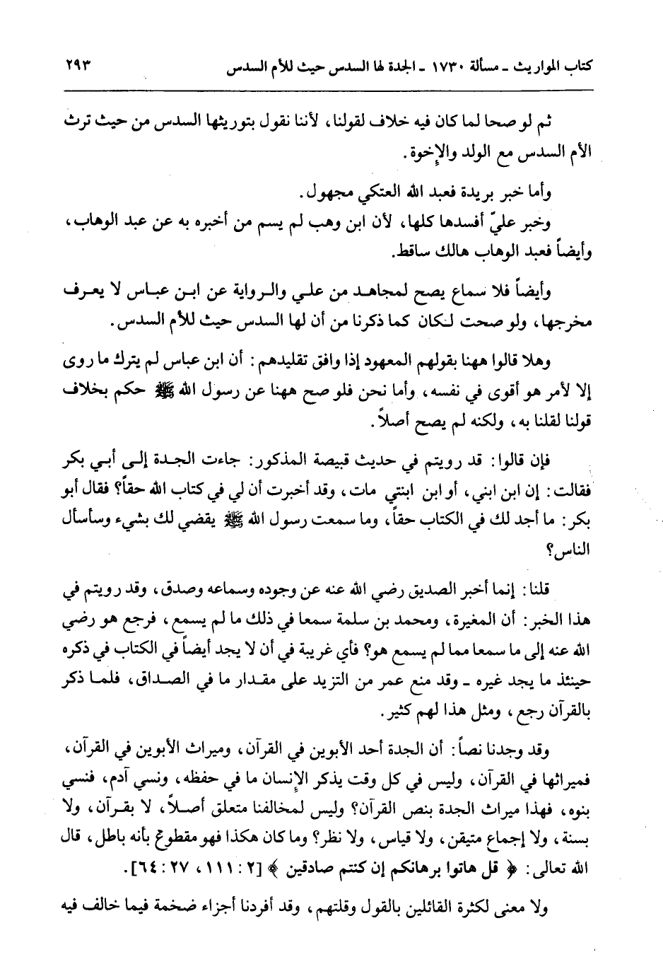 وَقَدْ وَجَدْنَا نَصًّا: أَنَّ الْجَدَّةَ أَحَدُ الْأَبَوَيْنِ فِي الْقُرْآنِ، وَمِيرَاثُ الْأَبَوَيْنِ فِي الْقُرْآنِ، فَمِيرَاثُهَا فِي الْقُرْآنِ، وَلَيْسَ فِي كُلِّ وَقْتٍ يَذْكُرُ الْإِنْسَانُ مَا فِي حِفْظِهِ، وَنَسِيَ آدَم، فَنَسِيَ بَنُوهُ، فَهَذَا مِيرَاثُ الْجَدَّةِ بِنَصِّ الْقُرْآنِ؟ وَلَيْسَ لِمُخَالِفِنَا مُتَعَلَّقٌ أَصْلًا، لَا بِقُرْآنٍ، وَلَا بِسُنَّةٍ، وَلَا إجْمَاعٍ مُتَيَقَّنٍ، وَلَا قِيَاسٍ، وَلَا نَظَرٍ؟ وَمَا كَانَ هَكَذَا فَهُوَ مَقْطُوعٌ بِأَنَّهُ بَاطِلٌ، قَالَ اللَّهُ تَعَالَى: {قُلْ هَاتُوا بُرْهَانَكُمْ إِنْ كُنْتُمْ صَادِقِينَ} [البقرة: 111]
