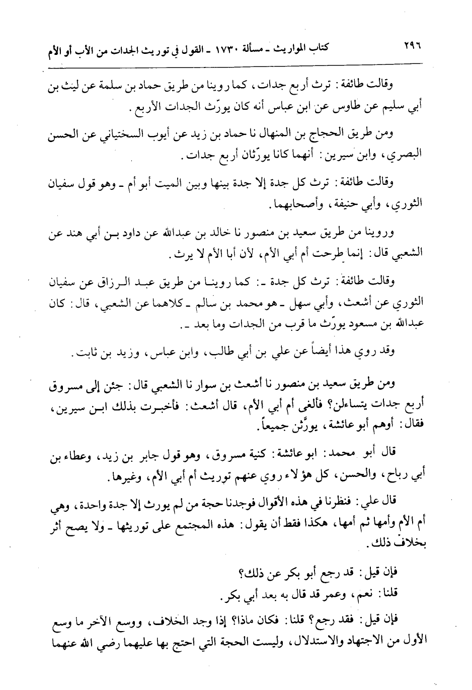 وَمِنْ طَرِيقِ سَعِيدِ بْنِ مَنْصُورٍ نا أَشْعَثُ بْنُ سَوَّارٍ نا الشَّعْبِيُّ قَالَ: جِئْنَ إلَى مَسْرُوقٍ أَرْبَعُ جَدَّاتٍ يَتَسَاءَلْنَ؟ فَأَلْغَى أُمَّ أَبِي الْأُمِّ، قَالَ أَشْعَثُ: فَأَخْبَرْت بِذَلِكَ ابْنَ سِيرِينَ، فَقَالَ: أَوْهَمَ أَبُو عَائِشَةَ، يُوَرَّثْنَ جَمِيعًا.