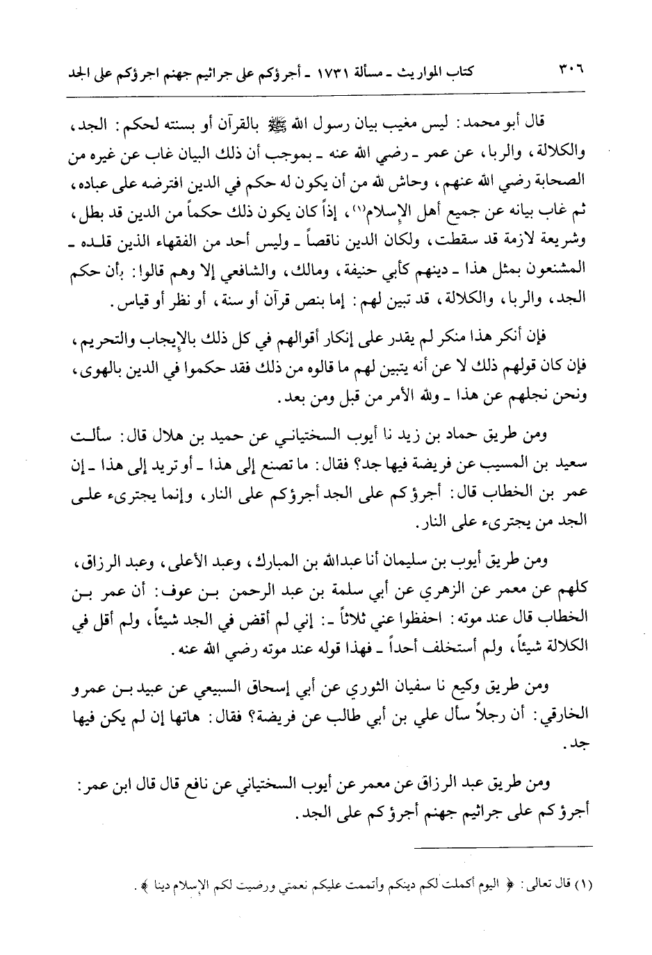 وَمِنْ طَرِيقِ حَمَّادِ بْنِ زَيْدٍ نا أَيُّوبُ السِّخْتِيَانِيُّ عَنْ حُمَيْدِ بْنِ هِلَالٍ قَالَ: سَأَلْت سَعِيدَ بْنَ الْمُسَيِّبِ عَنْ فَرِيضَةٍ فِيهَا جَدٌّ؟ فَقَالَ: مَا تَصْنَعُ إلَى هَذَا - أَوْ تُرِيدُ إلَى هَذَا - إنَّ عُمَرَ بْنَ الْخَطَّابِ قَالَ: أَجْرَؤُكُمْ عَلَى الْجَدِّ أَجْرَؤُكُمْ عَلَى النَّارِ، وَإِنَّمَا يَجْتَرِئُ عَلَى الْجَدِّ مَنْ يَجْتَرِئُ عَلَى النَّارِ.