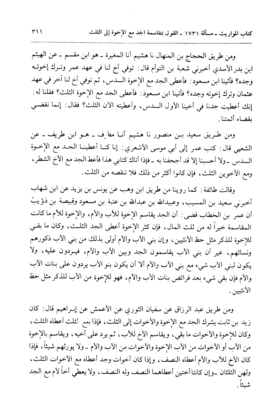 وَمِنْ طَرِيقِ سَعِيدِ بْنِ مَنْصُورٍ نا هُشَيْمٌ أَنَا مُطَرِّفُ - هُوَ ابْنُ طَرِيفٍ - عَنْ الشَّعْبِيِّ قَالَ: كَتَبَ عُمَرُ إلَى أَبِي مُوسَى الْأَشْعَرِيِّ: إنَّا كُنَّا أَعْطَيْنَا الْجَدَّ مَعَ الْإِخْوَةِ السُّدُسَ - وَلَا أَحْسَبُنَا إلَّا قَدْ أَجْحَفْنَا بِهِ - فَإِذَا أَتَاك كِتَابِي هَذَا فَأَعْطِ الْجَدَّ مَعَ الْأَخِ الشَّطْرَ، وَمَعَ الْأَخَوَيْنِ الثُّلُثَ، فَإِنْ كَانُوا أَكْثَرَ مِنْ ذَلِكَ فَلَا تُنْقِصْهُ مِنْ الثُّلُثِ.