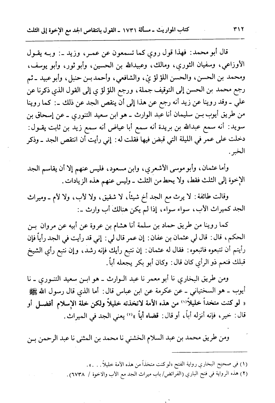 قَالَ أَبُو مُحَمَّدٍ: فَهَذَا قَوْلٌ رُوِيَ كَمَا تَسْمَعُونَ عَنْ عُمَرَ، وَزَيْدٍ -: وَبِهِ يَقُولُ الْأَوْزَاعِيِّ، وَسُفْيَانُ الثَّوْرِيُّ، وَمَالِكٌ، وَعُبَيْدُ اللَّهِ بْنُ الْحُسَيْنِ، وَأَبُو ثَوْرٍ، وَأَبُو يُوسُفَ، وَمُحَمَّدُ بْنُ الْحَسَنِ، وَالْحَسَنُ اللُّؤْلُؤِيُّ، وَالشَّافِعِيُّ، وَأَحْمَدُ بْنُ حَنْبَلٍ، وَأَبُو عُبَيْدٍ - ثُمَّ رَجَعَ مُحَمَّدُ بْنُ الْحَسَنِ إلَى التَّوْقِيفِ جُمْلَةً، وَرَجَعَ اللُّؤْلُؤِيُّ إلَى الْقَوْلِ الَّذِي ذَكَرْنَا عَنْ عَلِيٍّ - وَقَدْ رُوِّينَا عَنْ زَيْدٍ أَنَّهُ رَجَعَ عَنْ هَذَا إلَى أَنْ يُنْقَصَ الْجَدُّ عَنْ ذَلِكَ -: كَمَا رُوِّينَا مِنْ طَرِيقِ أَيُّوبَ بْنِ سُلَيْمَانَ نا عَبْدُ الْوَارِثِ - هُوَ ابْنُ سَعِيدٍ التَّنُّورِيُّ - عَنْ إِسْحَاقَ بْنِ سُوَيْد: أَنَّهُ سَمِعَ عَبْدَ اللَّهِ بْنَ بُرَيْدَةَ أَنَّهُ سَمِعَ أَبَا عِيَاضٍ أَنَّهُ سَمِعَ زَيْدَ بْنَ ثَابِتٍ يَقُولُ: دَخَلْت عَلَى عُمَرَ فِي اللَّيْلَةِ الَّتِي قُبِضَ فِيهَا فَقُلْت لَهُ: إنِّي رَأَيْت أَنْ أَنْتَقِصَ الْجَدَّ - وَذَكَرَ الْخَبَرَ.
