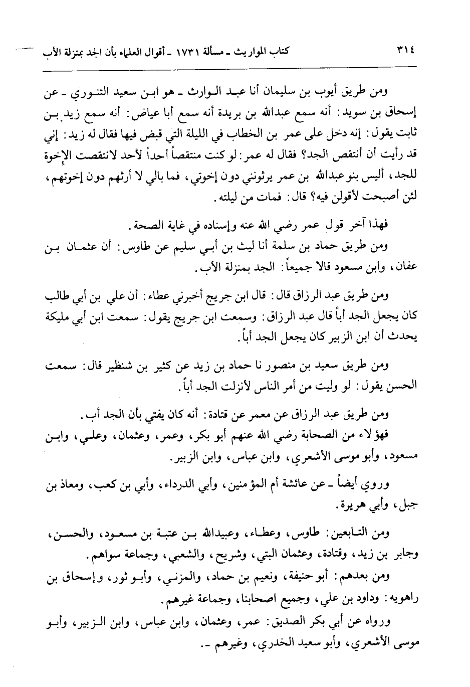 وَمِنْ التَّابِعِينَ: طَاوُسٍ، وَعَطَاءٌ، وَعُبَيْدُ اللَّهِ بْنُ عُتْبَةَ بْنِ مَسْعُودٍ، وَالْحَسَنُ، وَجَابِرُ بْنُ زَيْدٍ، وَقَتَادَةُ، وَعُثْمَانُ الْبَتِّيُّ، وَشُرَيْحٌ، وَالشَّعْبِيُّ، وَجَمَاعَةٌ سِوَاهُمْ. وَمِنْ بَعْدِهِمْ: أَبُو حَنِيفَةَ، وَنُعَيْمُ بْنُ حَمَّادٍ، وَالْمُزَنِيُّ، وَأَبُو ثَوْرٍ، وَإِسْحَاقُ بْنُ رَاهْوَيْهِ: وَدَاوُد بْنُ عَلِيٍّ، وَجَمِيعُ أَصْحَابِنَا، وَجَمَاعَةٌ غَيْرُهُمْ.