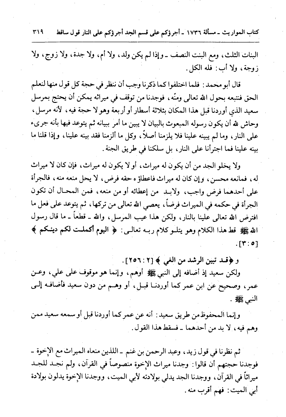 وَلَا يَخْلُو الْجَدُّ مِنْ أَنْ يَكُونَ لَهُ مِيرَاثٌ، أَوْ لَا يَكُونَ لَهُ مِيرَاثٌ، فَإِنْ كَانَ لَا مِيرَاثَ لَهُ، فَمَانِعُهُ مُحْسِنٌ، وَإِنْ كَانَ لَهُ مِيرَاثٌ فَإِعْطَاؤُهُ حَقَّهُ فَرْضٌ، لَا يَحِلُّ مَنْعُهُ مِنْهُ، فَالْجُرْأَةُ عَلَى أَحَدِهِمَا فَرْضٌ وَاجِبٌ، وَلَا بُدَّ مِنْ إعْطَائِهِ أَوْ مِنْ مَنْعِهِ، فَمِنْ الْمُحَالِ أَنْ تَكُونَ الْجُرْأَةُ فِي حُكْمِهِ فِي الْمِيرَاثِ فَرْضًا، يَعْصِي اللَّهَ تَعَالَى مَنْ تَرَكَهَا، ثُمَّ يَتَوَعَّدُ عَلَى فِعْلِ مَا افْتَرَضَ اللَّهُ تَعَالَى عَلَيْنَا بِالنَّارِ، وَلَكِنَّ هَذَا عَيْبُ الْمُرْسَلِ، وَاَللَّهِ - قَطْعًا - مَا قَالَ رَسُولُ اللَّهِ - صَلَّى اللَّهُ عَلَيْهِ وَسَلَّمَ - قَطُّ هَذَا الْكَلَامَ وَهُوَ يَتْلُو كَلَامَ رَبِّهِ تَعَالَى: {الْيَوْمَ أَكْمَلْتُ لَكُمْ دِينَكُمْ} [المائدة: 3] .