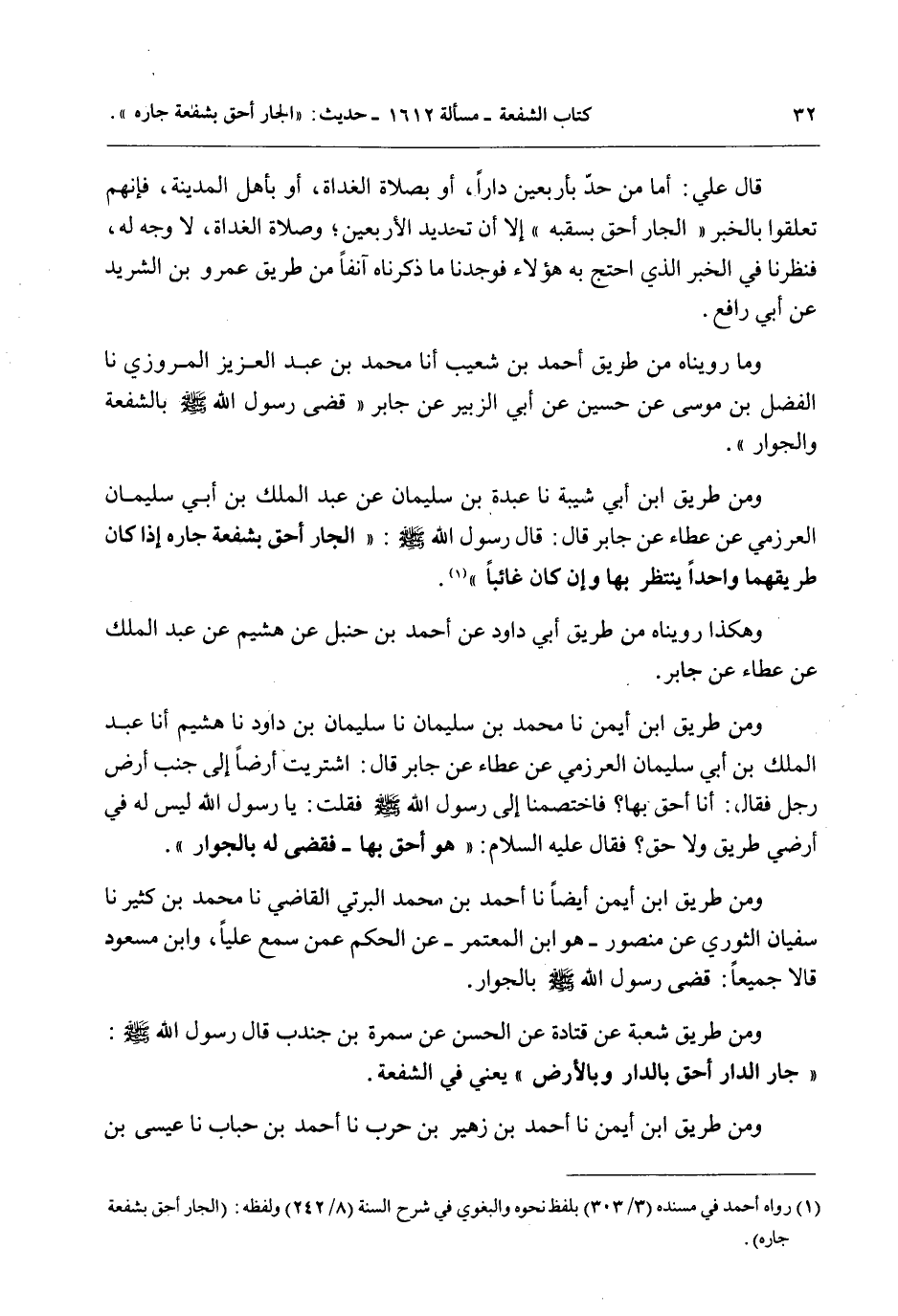 قَالَ عَلِيٌّ: أَمَّا مَنْ حَدَّ بِأَرْبَعِينَ دَارًا، أَوْ بِصَلَاةِ الْغَدَاةِ، أَوْ بِأَهْلِ الْمَدِينَةِ، فَإِنَّهُمْ تَعَلَّقُوا بِالْخَبَرِ «الْجَارُ أَحَقُّ بِسَقَبِهِ» إلَّا أَنَّ تَحْدِيدَ الْأَرْبَعِينَ؛ وَصَلَاةَ الْغَدَاةِ، لَا وَجْهَ لَهُ، فَنَظَرْنَا فِي الْخَبَرِ الَّذِي احْتَجَّ بِهِ هَؤُلَاءِ فَوَجَدْنَا مَا ذَكَرْنَاهُ آنِفًا مِنْ طَرِيقِ عَمْرِو بْنِ الشَّرِيدِ عَنْ أَبِي رَافِعٍ.